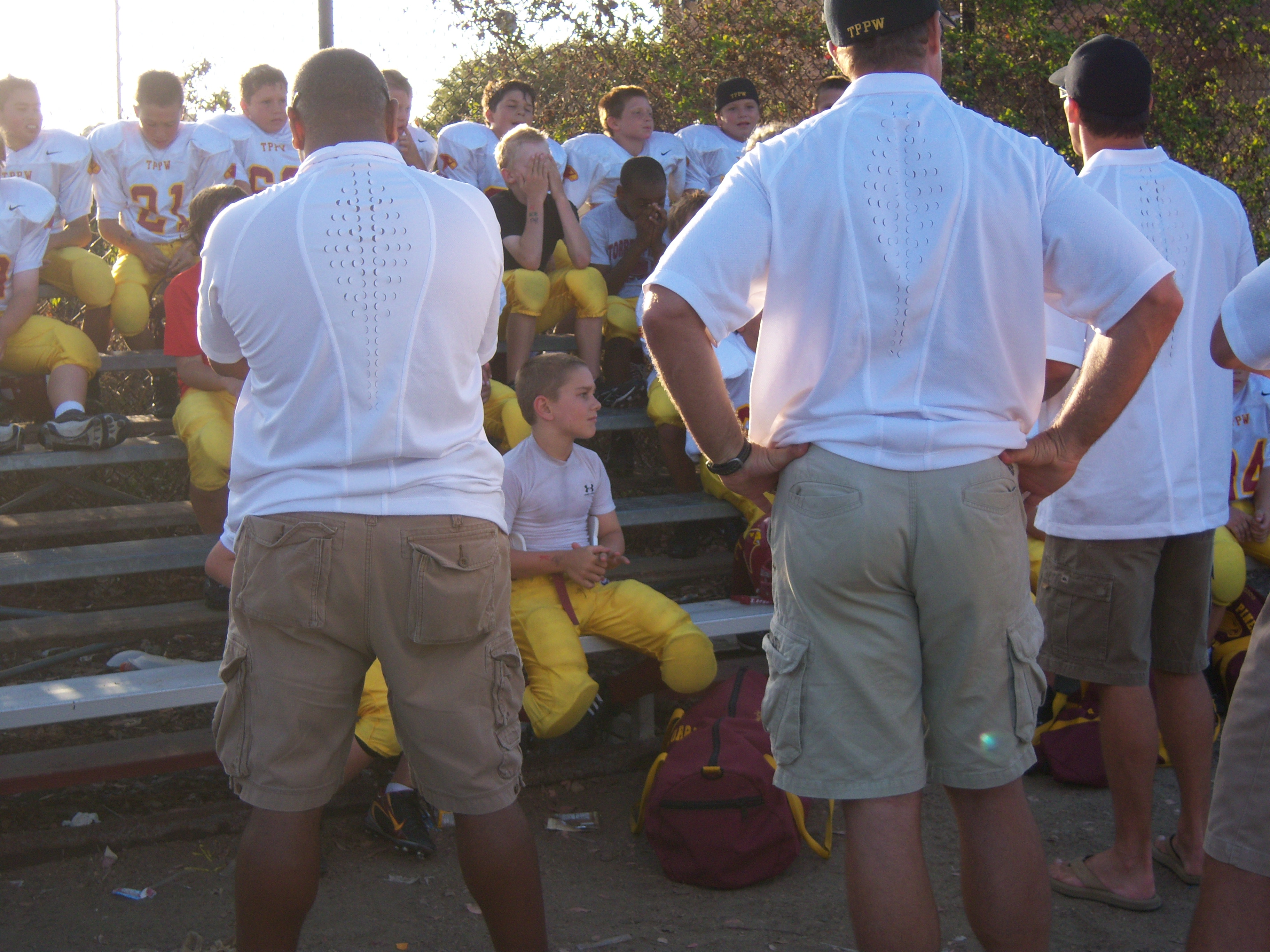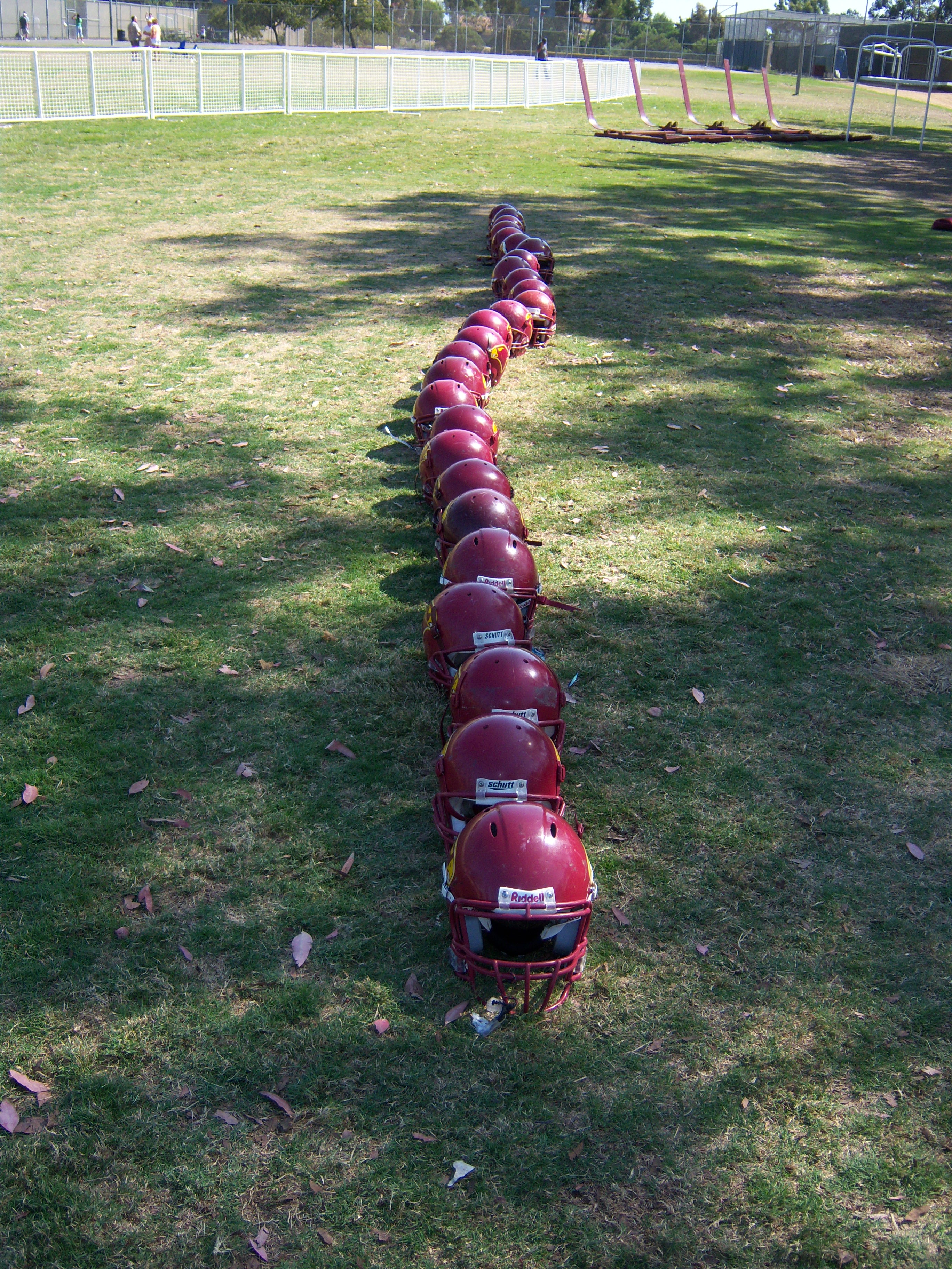 I cannot photograph the game action – my camera is not quite designed for that unless I get down really close, and I prefer to watch from the upper level so that I have a view of the entire field.  The boy played great again. This time, the offensive line was on right from the start and the Poway team just could not stop the Falcons. We were up 20-0 at the half. Coach Wolfie tells the team at halftime that if they score again then kids can start playing in different positions. There is a Pop Warner rule that no team can win by more than 28 points. Well, the one blight on today’s game was that they did let the other team score (meaning no ice cream today).  Ah well. It also meant they could go for a 5th touchdown. So the final score was 32-6. Sportsboy carried the ball a lot in the 2nd half and again got *this* close to a touchdown. He also made a spectacular open field ankle tackle. A great effort by the entire team. Way to start the season Golden Falcons!
