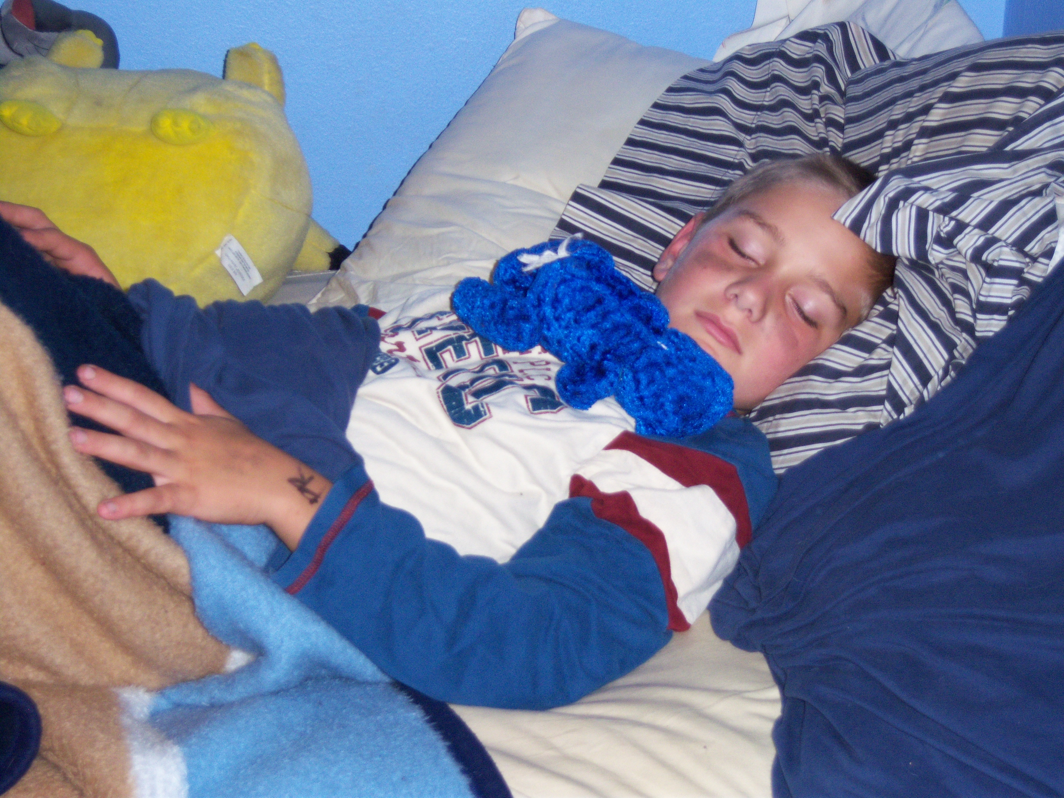 He bargained with me to let him shower in the morning. Eye black is still visible, on his hand you can still see the “P” and “K” that they write on him to remind that he is on the Punt and Kick return teams. Blue Bear was probably in his hands but ended up on his chest as his hands fell away and Pikachu leads the pile of other stuffed animals at his side against the wall. Little Sports Warrior At Rest :->