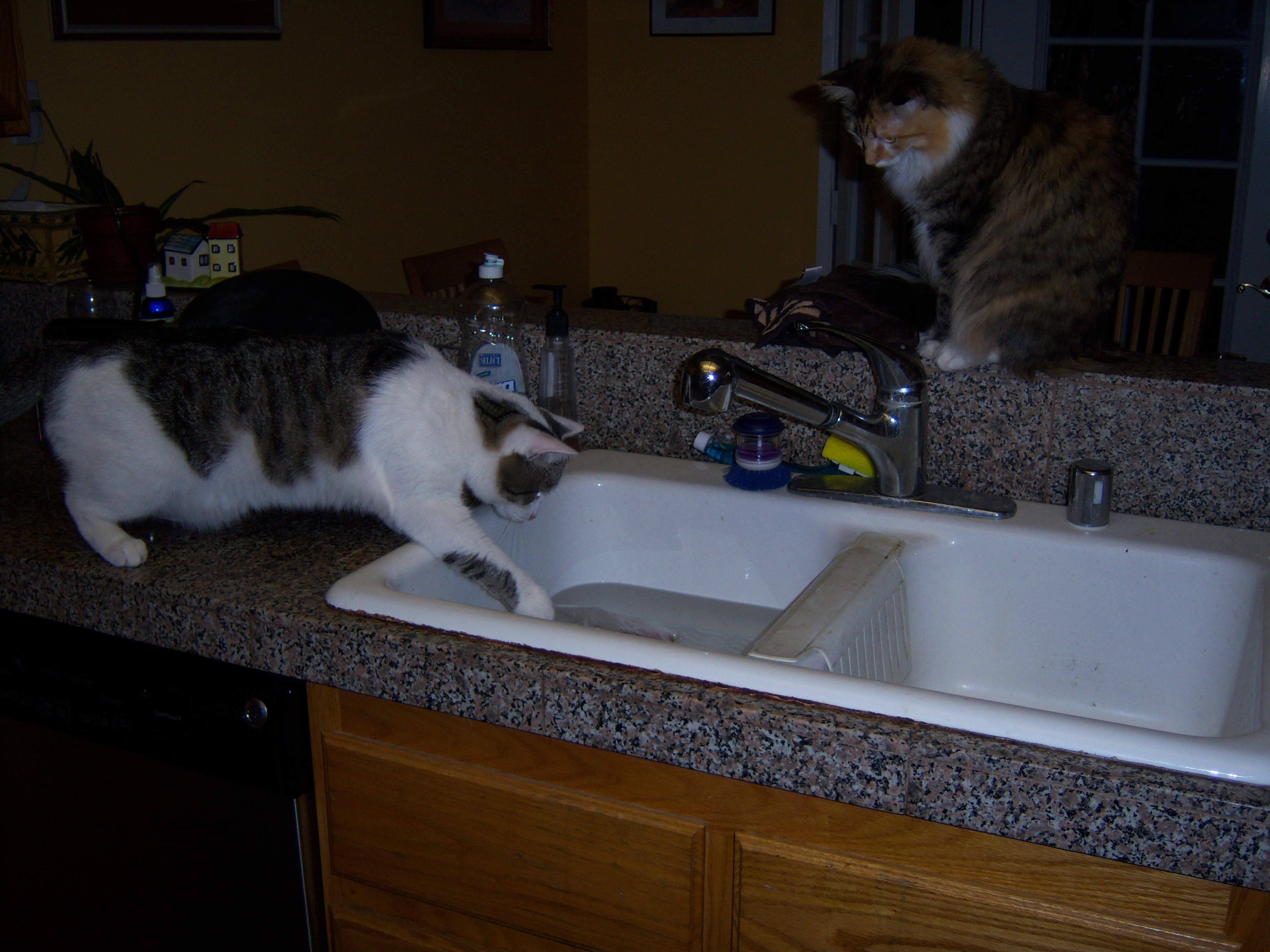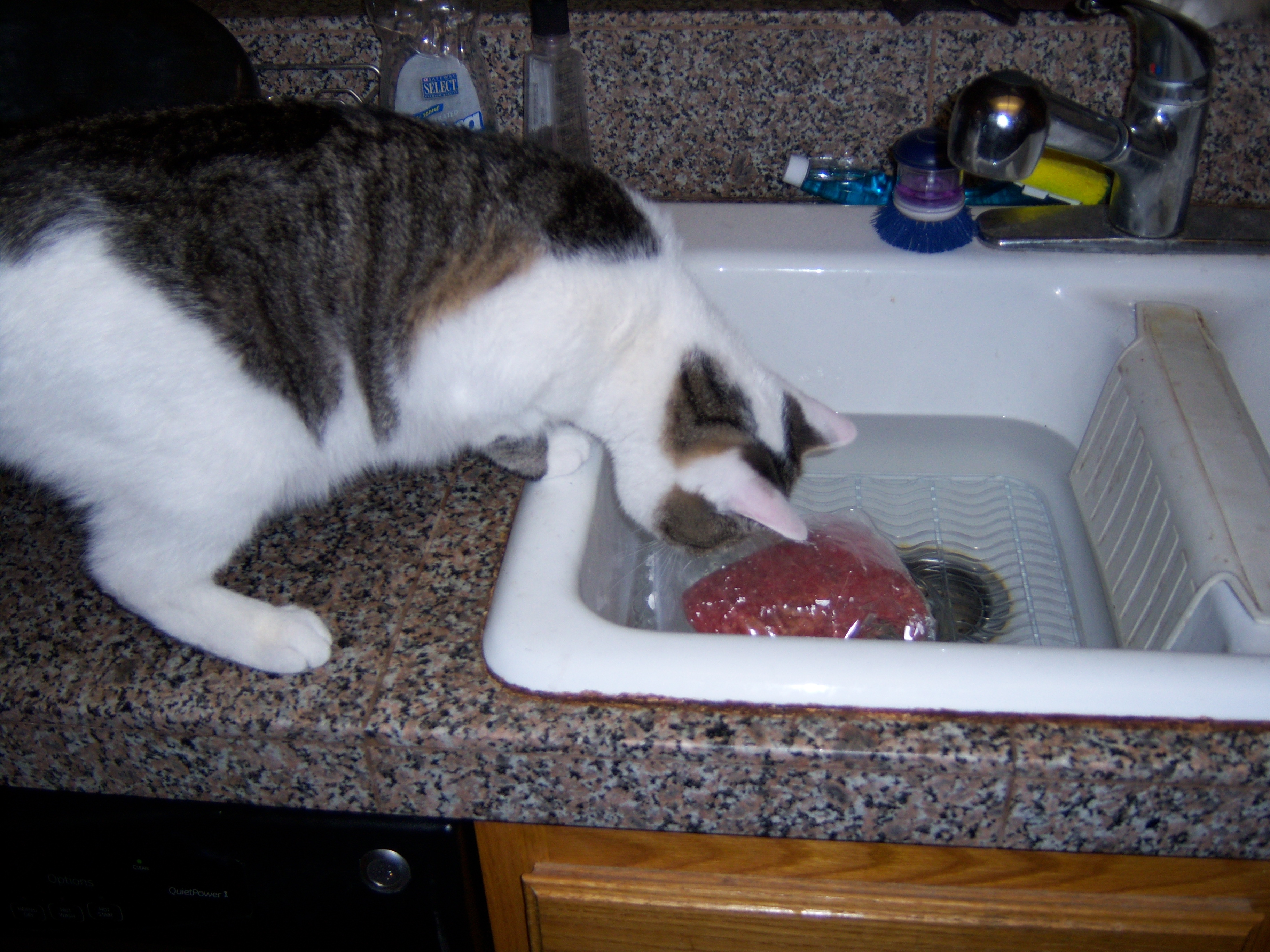 First, work from home on Thanksgiving week since schools are closed. Work must be done rather than it being pure vacation time off since there is this, oh, minor little trip possibly happening in less than two weeks. Since the weekend was spent out of the house at various football and baseball fields, focus during the first day at home on catching up on weekend chores. Cats love that. Pick up all their stray toys and put them in a pile. Bring out the vacuum. Watch one cat haul butt upstairs and the other climb up to the highest perch from which to watch the cleaning. Then, fold laundry. Cats love to help with that. Then sit down at the laptop with all the silent auction paperwork and try to get that to tie out. Periodically remove cat from paperwork. Scratch her head first, but then shoo her away. Finish auction work and transition to the PC and data entry for work. Shoo cat off paperwork and from out in front of pc monitor. Realize it is after 4:00 and the meal you want to make for dinner requires ground beef that is frozen. It’s not so late that you need to use the microwave, so just fill the sink with hot water and set the bag of meat there to defrost for about 30 mins. Now watch the cats: