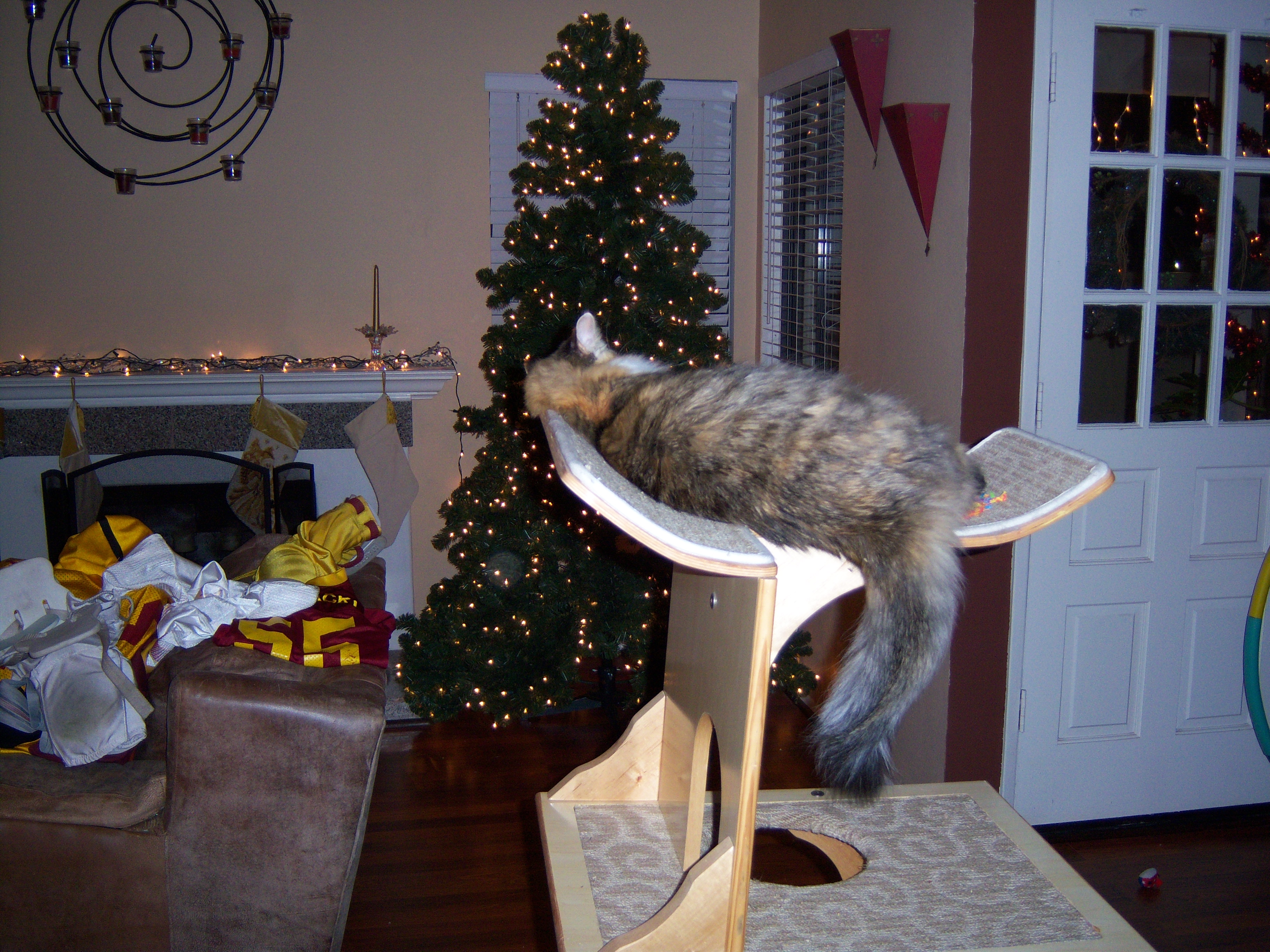 Inside – tree and mantle in beginning stages. Amber is at that moment more intrigued by her cat condo having been moved to a new spot:
