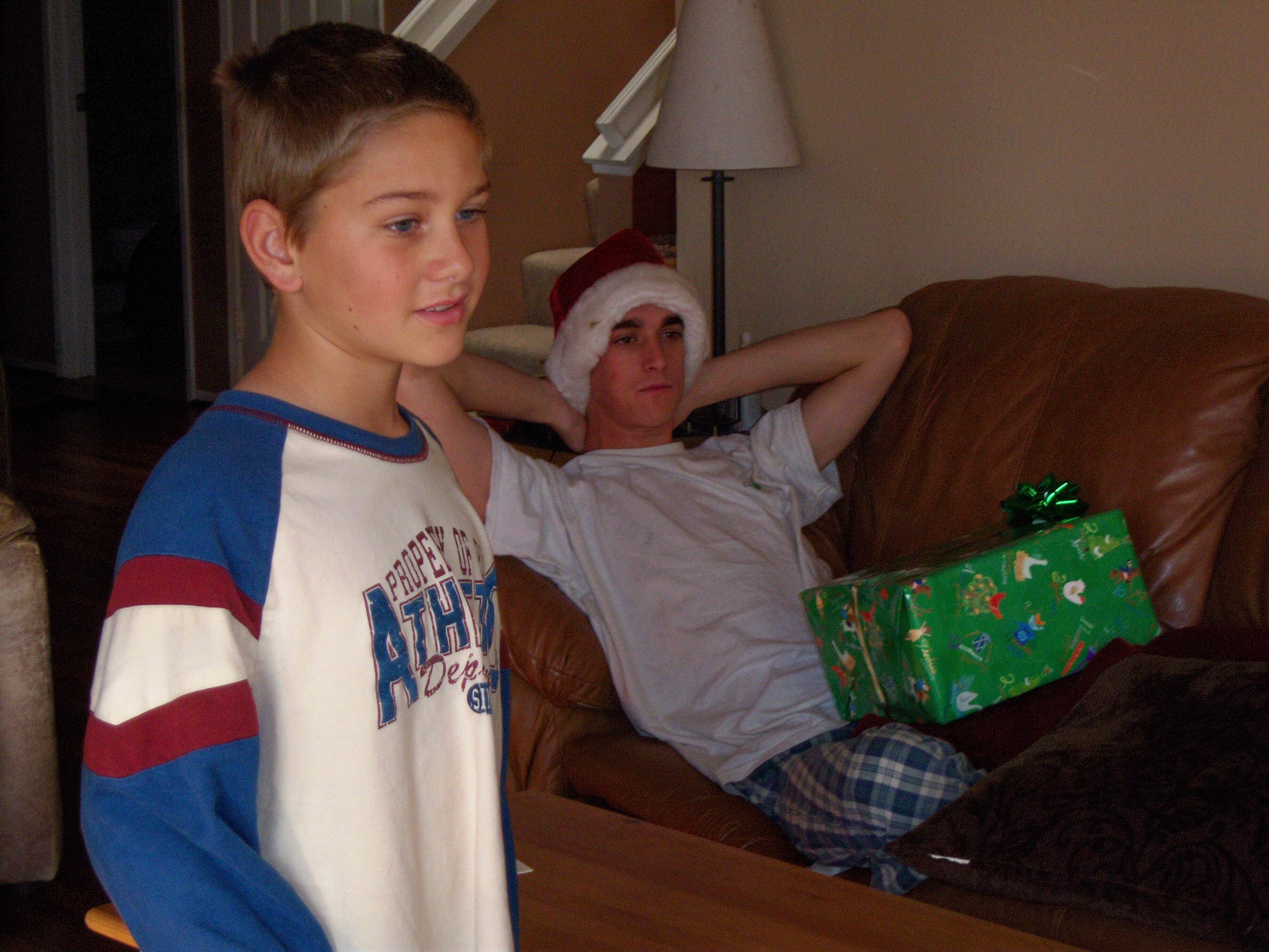 MM wears the Santa hat, but SB plays santa and hands out all the gifts. Then we played a rousing round of Cat-opoly. Yes, that is a cat themed monopoly game. You put up litter boxes and fish bones instead of houses and hotels and each cat card (property) that you purchase has a very cool cat fact on the back. Then we ate, cleaned, took a walk, and ate some more. Then everyone scattered, including us! I figured the cats wanted the house back for a bit as they had pretty much been holed up upstairs as soon as my parents arrived. So SB and I went with SP to his house to play with his sister’s dog for awhile since his family is out of town this week. Strangely, we did get hungry again after running around with Max and we had some dumplings there before coming home. SB is already attached to his MP3 player and we have to shout to get his attention 🙂 I think my favorite gift is a pair of framed photos of the cats that SP had made. Of course, he labeled the boxes as being from each cat…but then put the wrong label on the wrong package 🙂 He also promised we would work on getting that bed wish satisfied this year. No matter. It was a lovely day.
