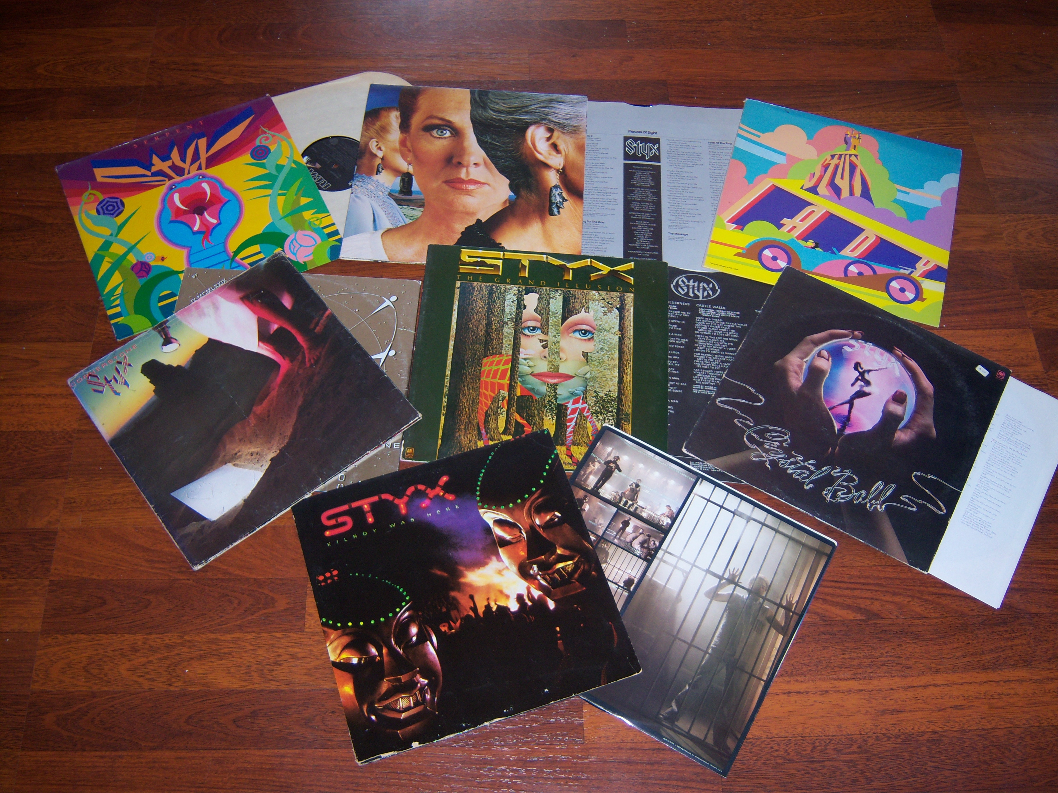 OK, feeling better after a shower and successfully sending Sportsboy off with a buddy to his tournament games. Oh, and a Starbucks mocha..those *really* help shake off the cobwebs and annoyances 🙂 So now I am home and planning the evening and am delving into the world of Styx. As I sat at my desk to go on Rhapsody to download some of their tunes, I kicked a pile of albums that has been on the floor under my desk since the post Christmas garage clean out. I’ve been trying to figure out what to do with these and have yet to take the time to come up with a solution. And what is right on top? A Styx album! Memories flood back and I realize that I probably have their entire collection at least through Mr Roboto in that pile. Sure enough: