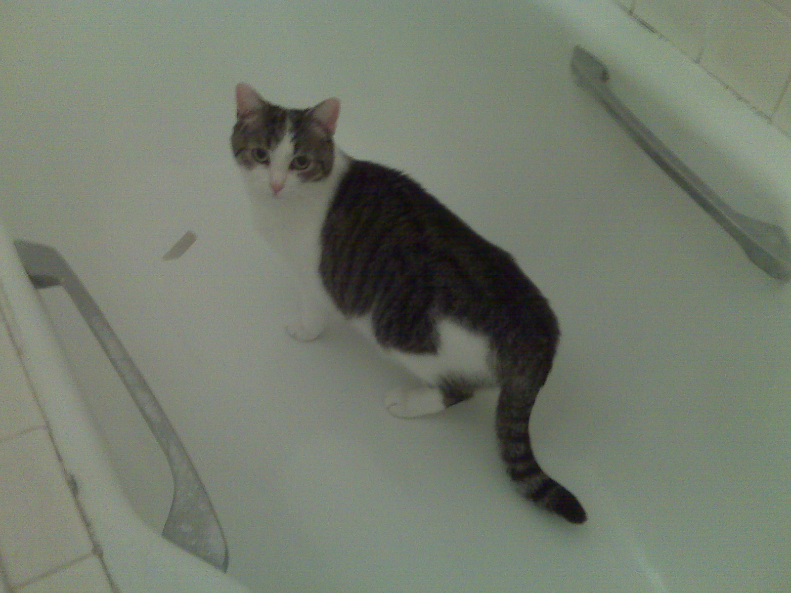 Do any other cat owners have one of these? I call him Bathroom Cat. He can frequently be found either in the shower or else on the floor in front of the shower. Mostly in it though. Always in my bathroom too. More oftne than not when I go in there to use it, he is there. Sometimes he startles me because he is sitting behind the shower doors and I don’t know he is there until he coos.
