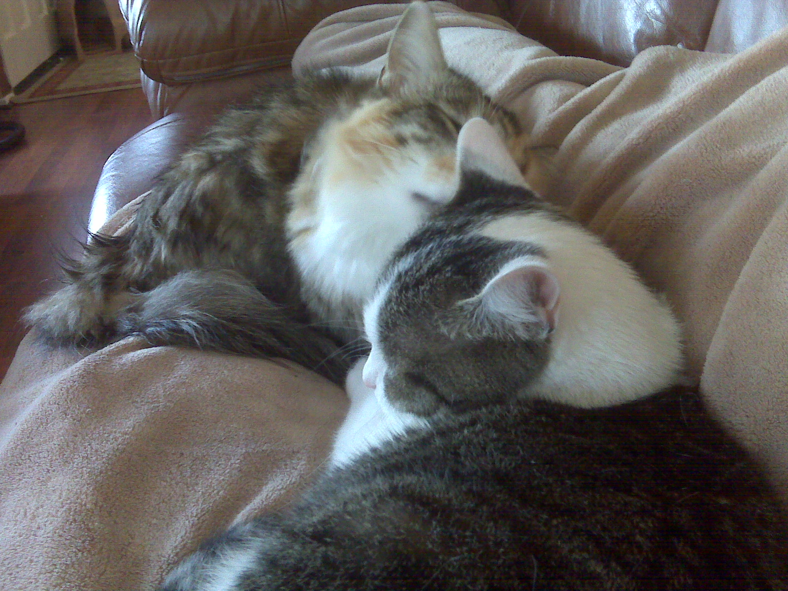 Oh, and I need to thank Robyn for educating me on what a cat does when in heat. Her description and picture allowed me to identify the “funny thing” that orangecloud’s cat Molly was doing! She thought it was funny how Molly would scrunch her legs up and whine…I asked if Molly was fixed – nope! Guess what dear, your cat is in heat! Apparently she was doing some night time howling too. lol! Quite a contrast from my two lazy butts who spent the afternoon pinned to my side yesterday while I read: