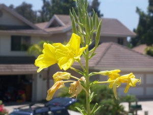 The yellow flowers bloomed at the top of an over 4 foot stalk growing at the top of the slope on the side yard. I took that picture from insied the wall of the flowers which are just on the other side, but have grown so high that they are visible over the top. If the stalk itself was not so gangly looking and kind of ugly, I’d be more inclined to let these grow! I still might…not really in the mood to climb to the top and pull stuff out!