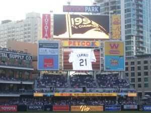 I was sitting behind the dugout and first base and had a wonderful view. I love how the current Padres are sitting at the top of the dugout to watch the ’98 players. There were plenty of tear producing moments, but having general manager Kevin Towers bring out the jersey of the late Ken Caminiti….