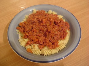 Pasta Bolognese! Since I got home too late on Sunday to have a Dream Dinner thawed out and ready for Monday night, I knew I would have to cook on my own. That worked out fine since I typically crave pasta after I travel for whatever reason! Now, everyone has their own opinion on bolognese. The sauce I had at the WhisknLadle was very beef oriented, a completely brown, brothy kind of sauce with no tomato/veggie flavor at all. It was yummy, just not what *I* personally refer to as bolognese. I prefer mine more like what you see above (not one I took last night, just one I found on the web which closely resembles what I make). So here is the version I make which I really love: