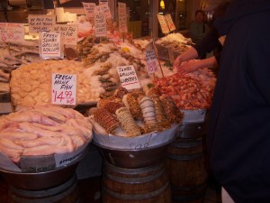 Hungry yet? Look at that seafood! The size of those lobsters can only be compared with the ones I saw in Portland Maine. But really, there is no way to walk through the Pike Place Market without getting hungry. And when you do, there are so many fabulous places to eat! I must say that the food on this trip was probably the best overall that we’ve had at one of our gatherings. A better blogger (you know, one who actually does some research ahead) would link to all of the fabulous eateries we visited. Perhaps one of the other blogging moms will be a Better Blogger ๐Ÿ™‚ I am a lazy one composing this at work so…just trust me that we ate well! UPDATE: I knew someone else would do the research. Oh, well, here is an obvious place I had to visit: