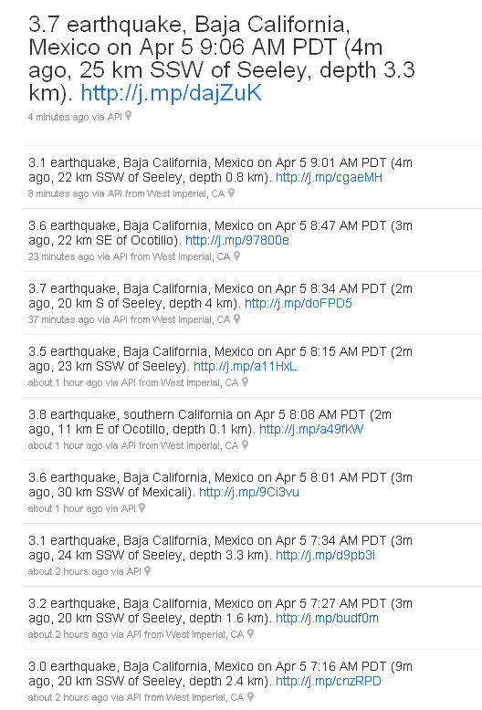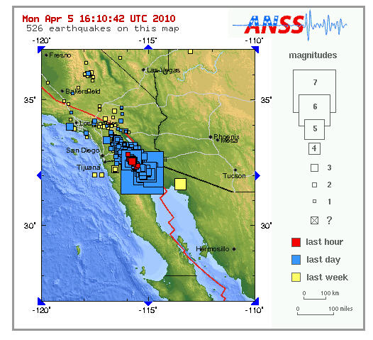 In case you missed it there was a wee bit of a shaker on Easter Sunday. Upon looking up this particular link at the USGS site you can see that the region where it hit had been rattling along for quite a bit even before the 7.2 one hit. After wards they have been coming fast and furious and not necessarily always along that same fault line since one shift in the earth can rub off (hah – get it?!) on another one pretty quickly.