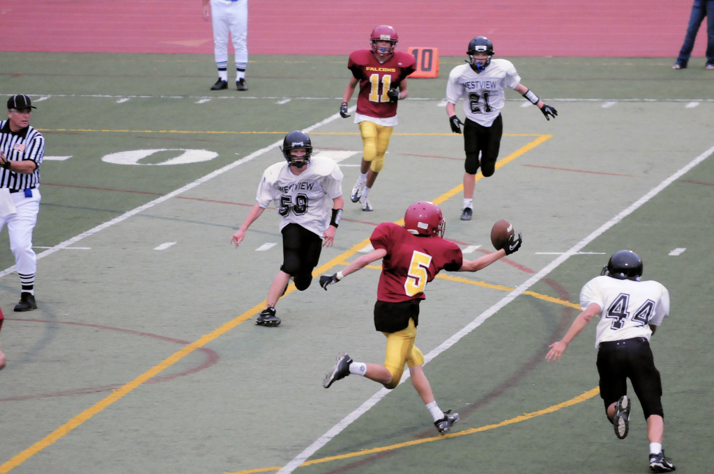 Fortunately it was a very GOOD game. All those things that we normally complained about after those prior loses vanished. They tackled VERY well. They didn’t let the referees take the game into their hands and miraculously, they threw the ball! A lot! And successfully too. Two players stood out – our two receivers/running backs. #11 is also the kicker and not only did he kick every extra point successfully, but his punts were all spectacular pinning opponents back. #5 showed us hands mindful of our own player from last year. He and #11 also had some game saving tackles. Yes, the starting lineup has been so depleted by injury (I counted 13 on the sidelines this game) that players are back to playing both ways though NOT on every play. It was a wild back and forth game that finally settled into the good guy’s hands when #5 stepped in front of the intended receiver to intercept a pass late in the 4th quarter of a tie ball game and ran it all the way in for the game winning TD.