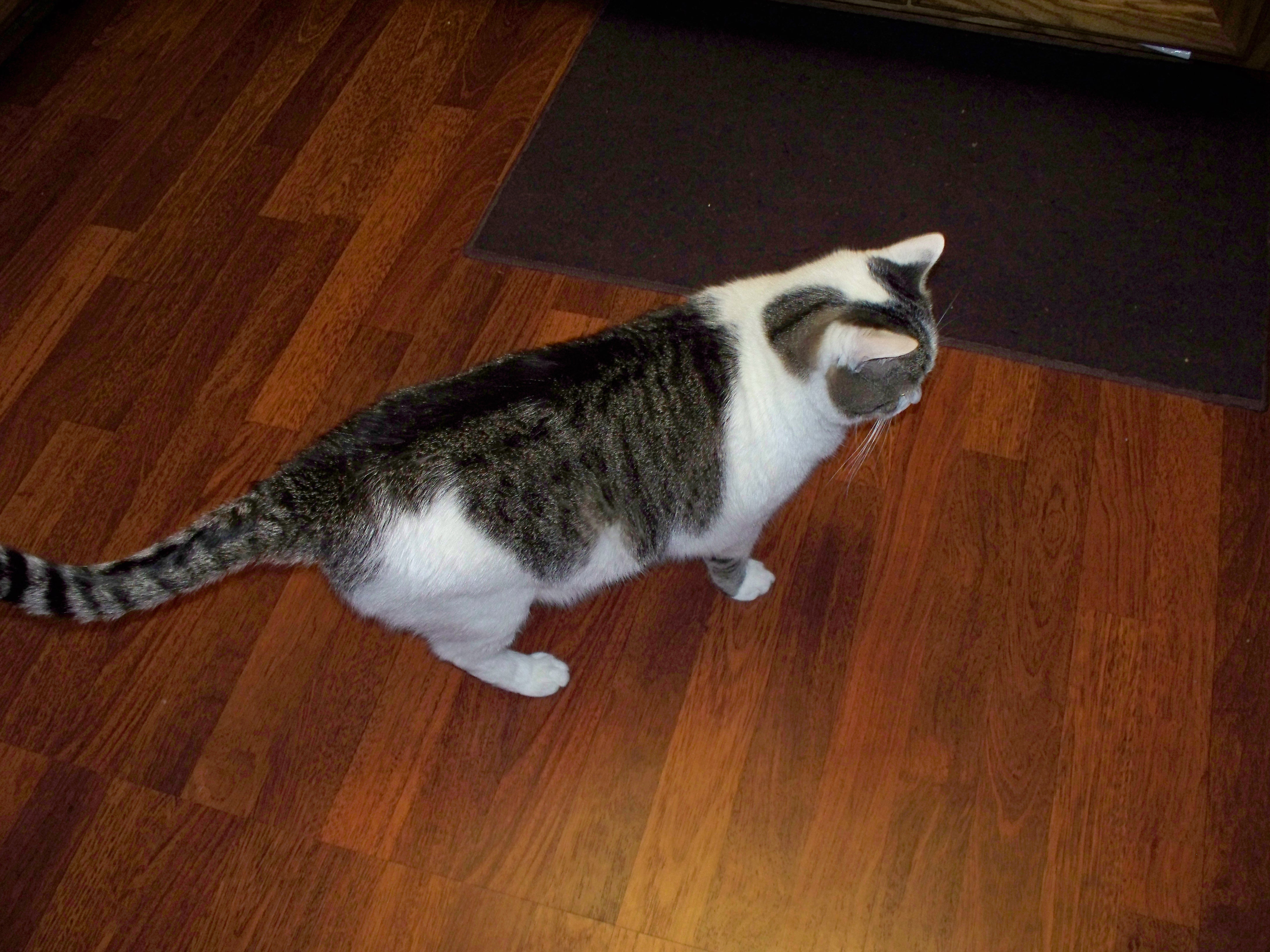 When I shoo him I say “Skitty kitty!” (I know, too cutsie by half. Sue me). Shorten it often to just “skitty!”. After a couple of times saying that and gently nudging his rear, he learned and all I had to do was say “skitty” and he’d move without the nudge. It even worked in other areas of the house like the middle of the staircase where he would plant himself in front of my feet (not trying to send me tumbling down the stairs on purpose of course, right? Right?!) Anyway, point is, he is smart enough to know that “skitty” mean he’d best move along and that was working quite well.