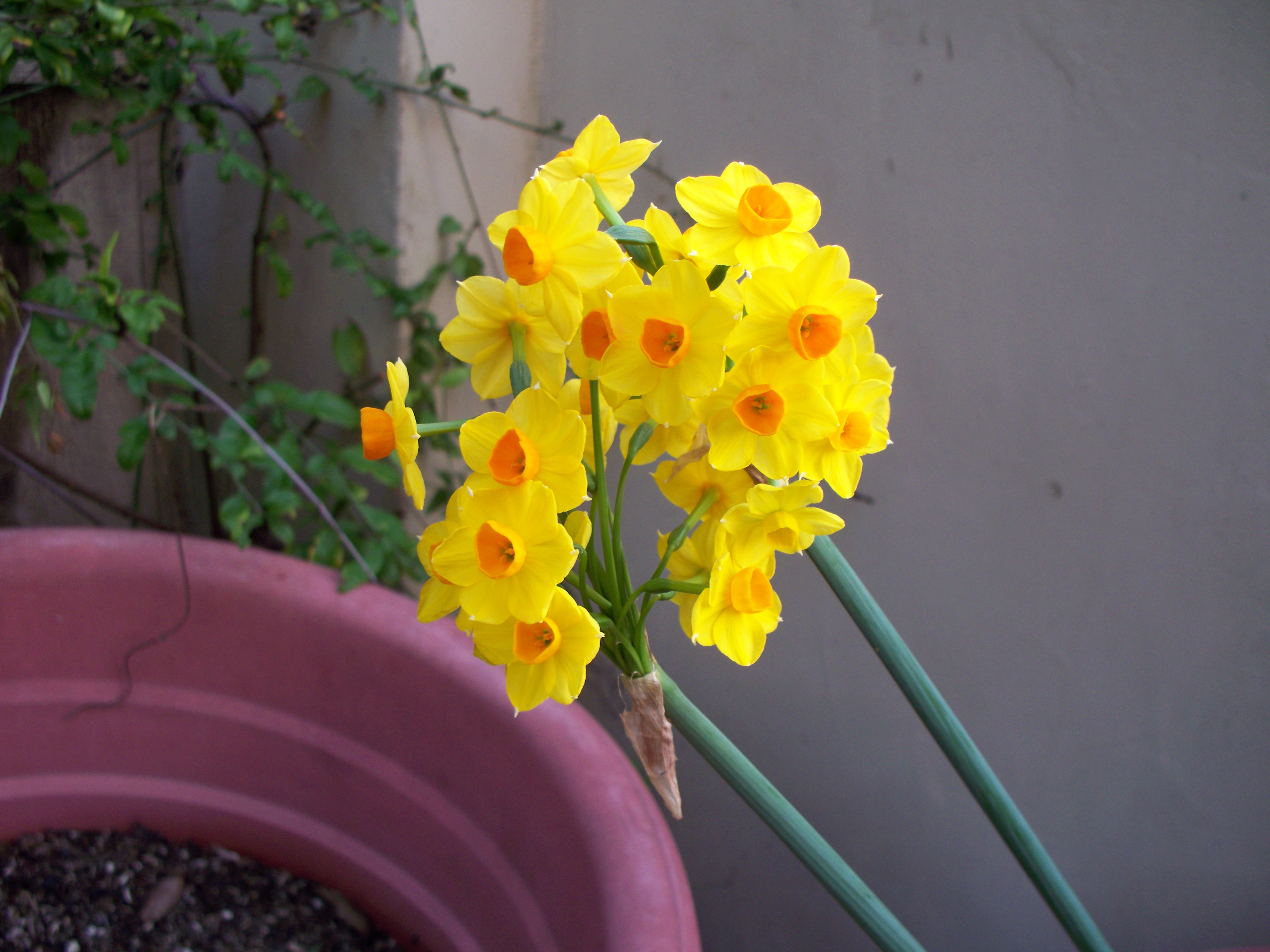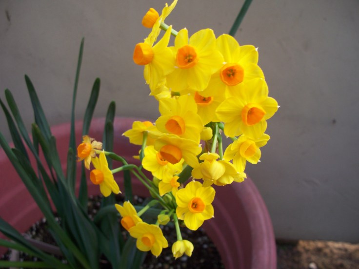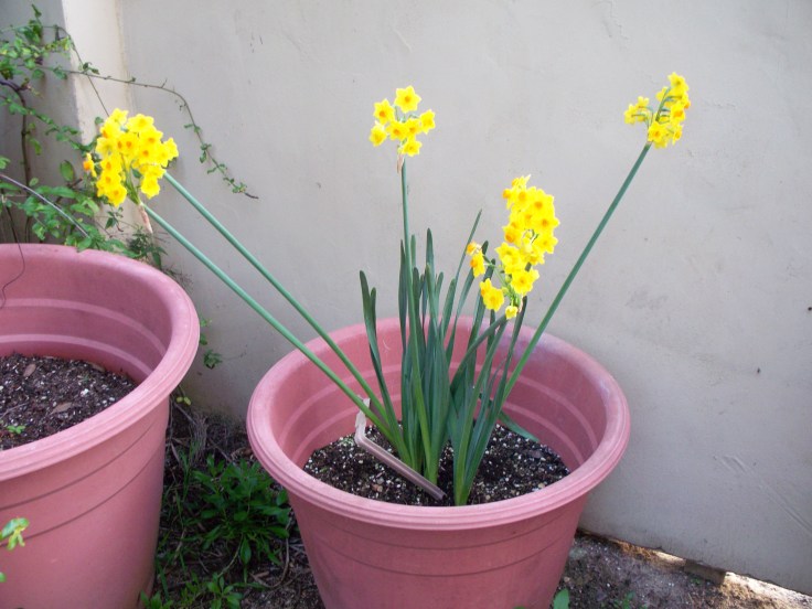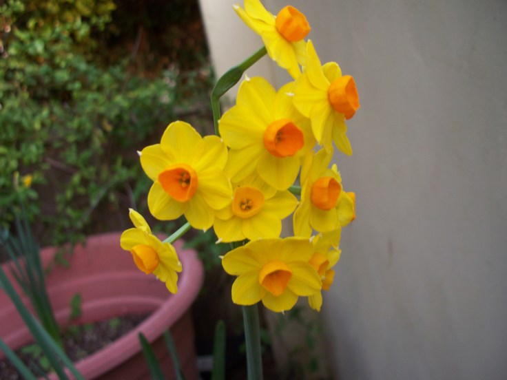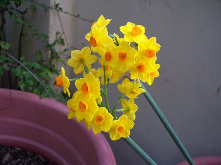 Saturday version of Friday beauty. Some pictures from this week in the back yard. I know daffodils are supposed to be February flowers, but these mini daffodil bulbs that I bought several years ago can’t wait that long. They are also becoming more and more prolific year to year. The spikes poked out in late October and the flowers started bursting out in December. They are at their peak now in this one pot, but a new set of plants have seeded in the other pot and are just starting to bloom. It’s such a lovely burst of yellow and orange against the wall in the corner and when you get close there is even a really lovely scent. I’ve never had daffodils before so these are a fun and cheerful discovery and I will surely continue to encourage them spreading themselves around the yard. Enjoy these lovely little bursts of floral sunshine. I’m going to enjoy the real sunshine in my yard. The bands of rain seem to have passed and now it’s down right warm and dry again. I am not complaining 🙂
