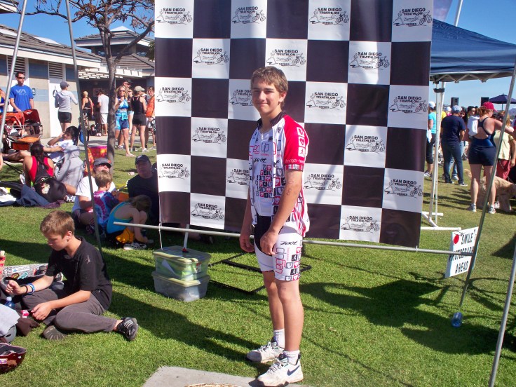 Official time was 1:15:34 – 5 out of 6 in his age group (fasted guy is one we’ve seen at both time trials & who I saw at the Coronado sprint came in at under an hour). More importantly we are fairly sure he beat his dad handily – which was his goal. THIS time 🙂