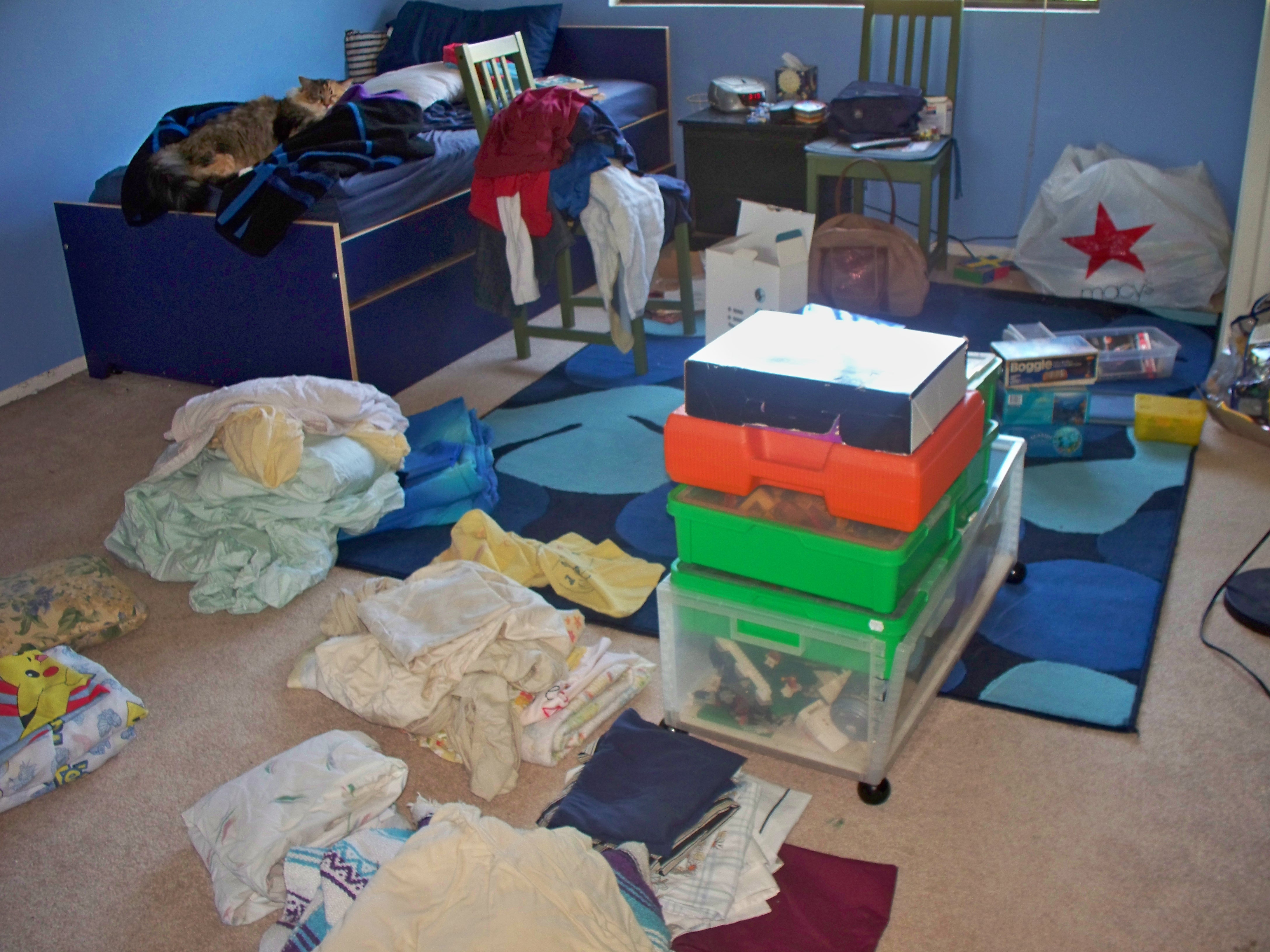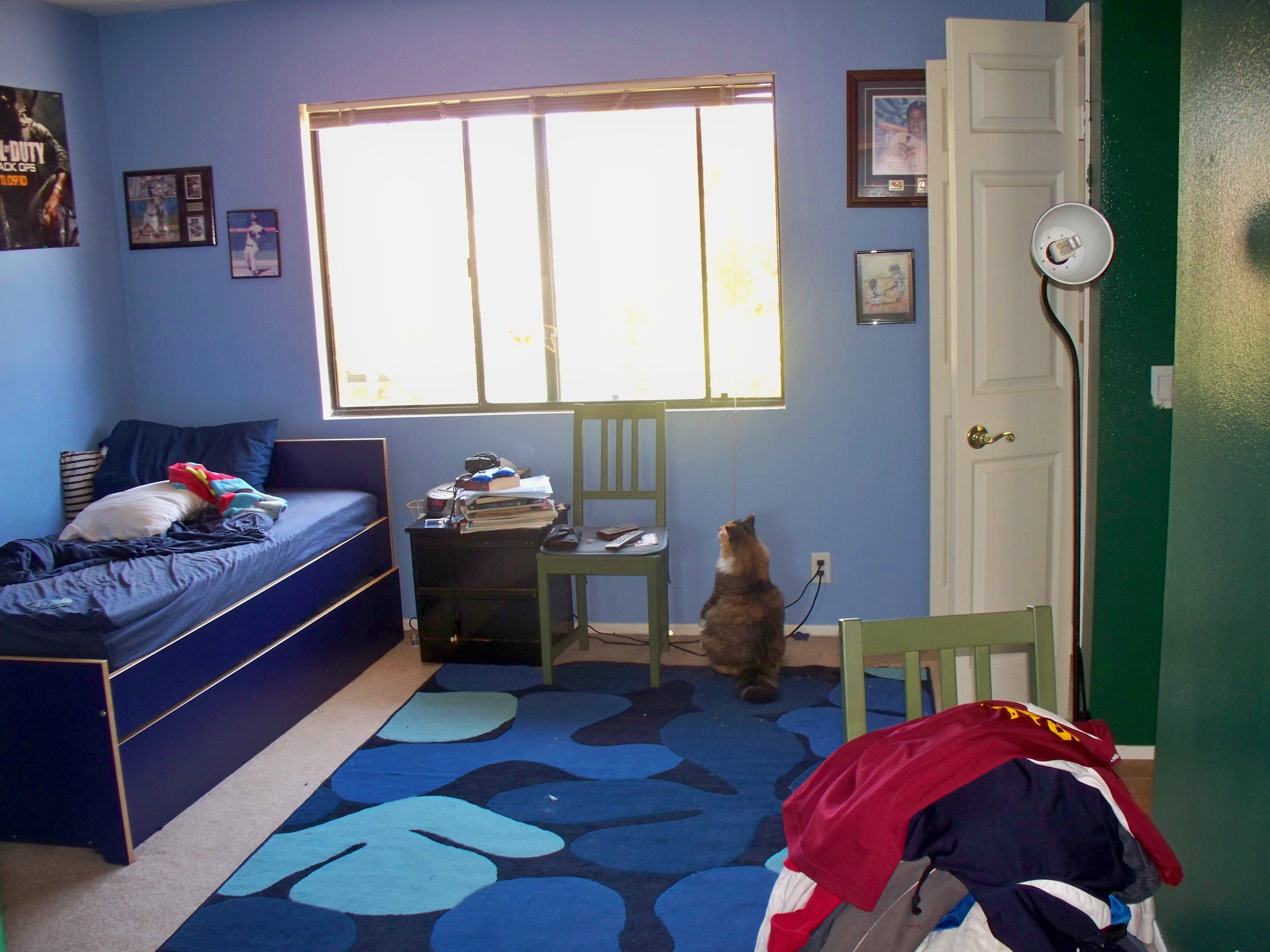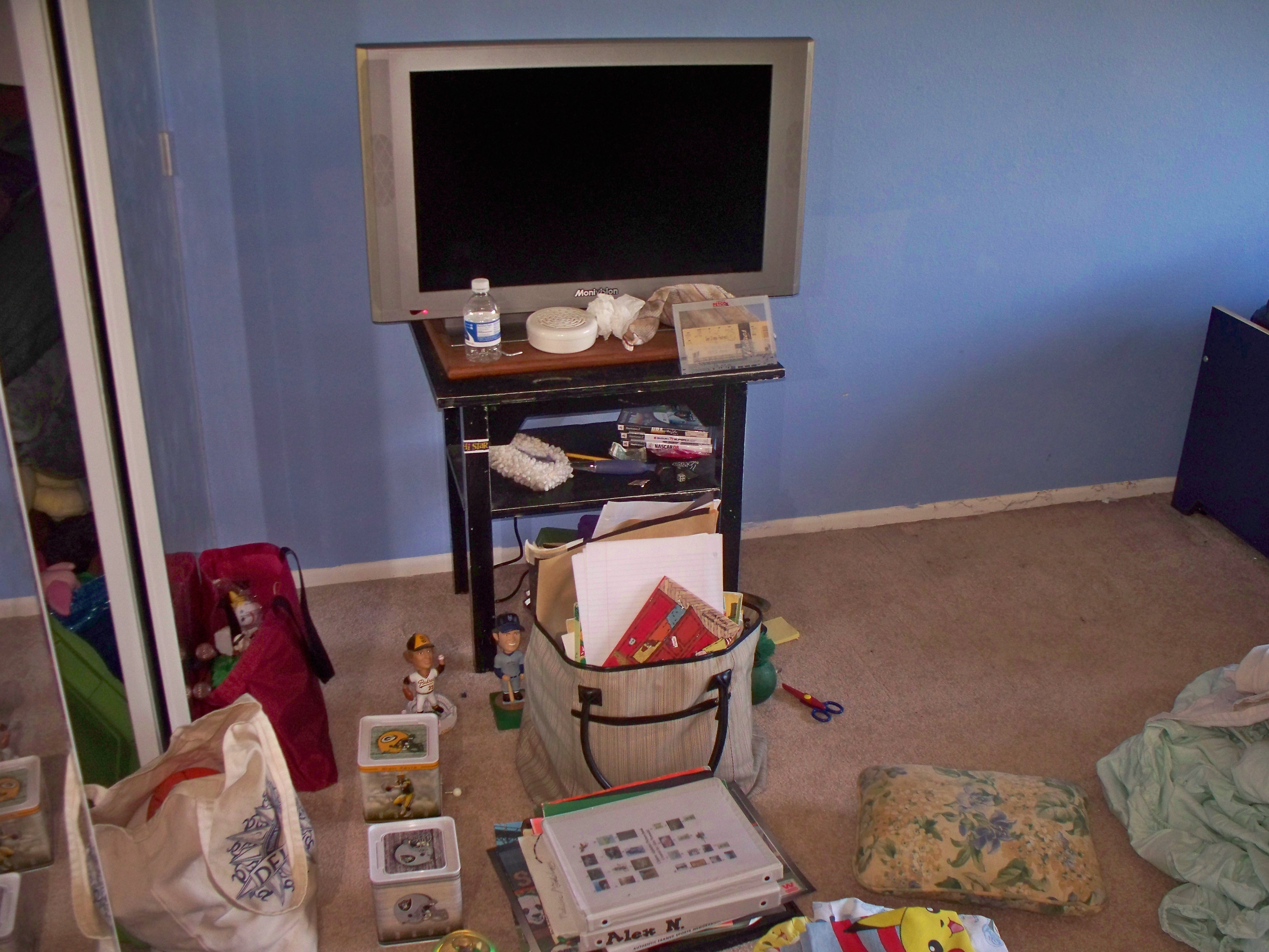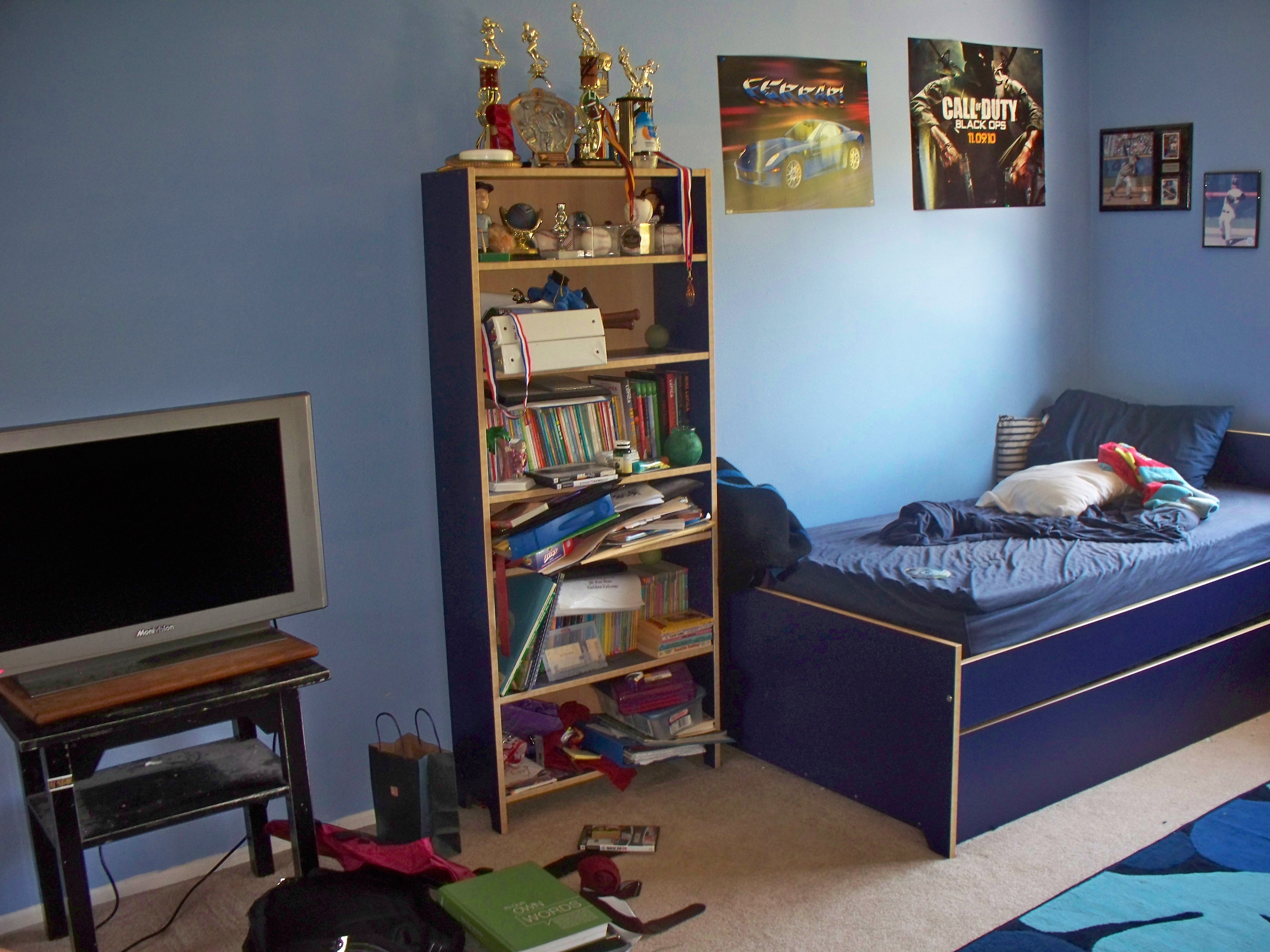 The bookcase is going entirely. The few books he wants to keep will store very nicely in his game closet. The trophies are going to be moved to the top shelf of another closet. His dresser is already placed in there. He’s a boy – he has no need for hanging more than a few items and I am not kidding about the closet space – he has two long ones – one has three sliders – and then he has what we call the game closet but which I guess is supposed to be a linen closet that is floor to ceiling shelves. No way he will never fill all that with clothes!