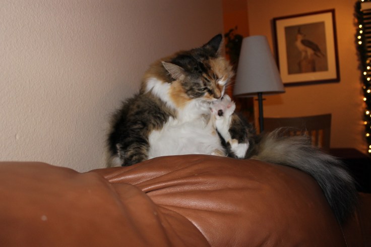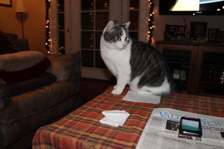 The cats are ready in their own way – Chip is as confused as ever and will most likely spend the whole day in my room under the bed though he did inspect things down here for a little while: