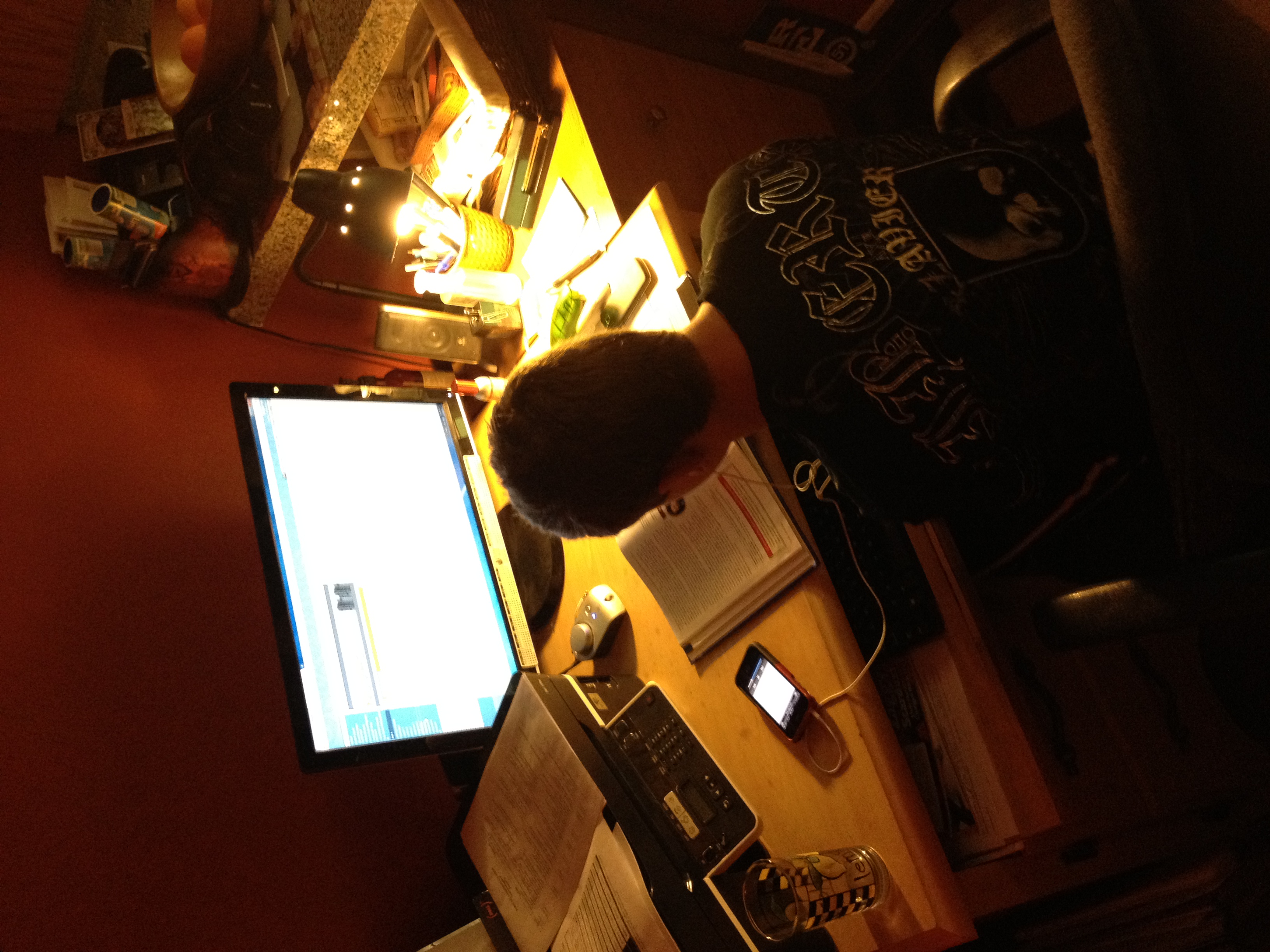 Of course, studying can’t really happen unless there is music in his ear. So, he has my old iphone 3Gs which is now basically an Ipod touch on steroids – it still has all the apps and music on it from when it was mine. His own phone is off to his right. He was working on an assignment from the online English course and had no idea I took these photos with my new iphone 4s. Gotta say I really like the camera upgrade I got on that one! Also – Siri rocks. She’s helped me setup reminders while I was driving home – because we all know that it is only while sitting in traffic that our brains engage on all those little things that need to get done – which we promptly forget when we reach our destinations.