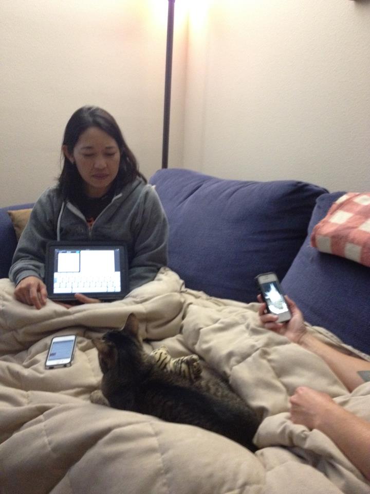Oh – and if you think that Alex is electronically overloaded while studying (the music really helps him focus as it always did for me too) – well – check out what was going on Super Bowl Sunday while I watched the game with the girls: