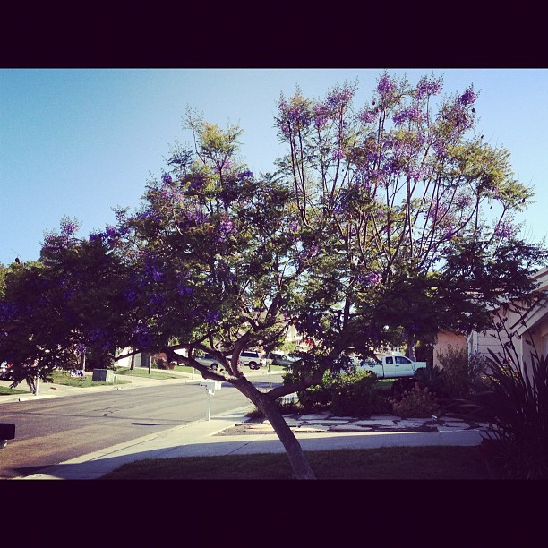 The jacaranda tree is the one in the yard next door to mine and I have been noticing on my runs around the area that they purple flowers are in full bloom right now. Really lovely.