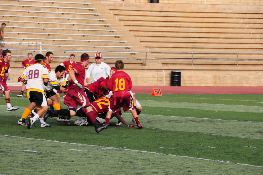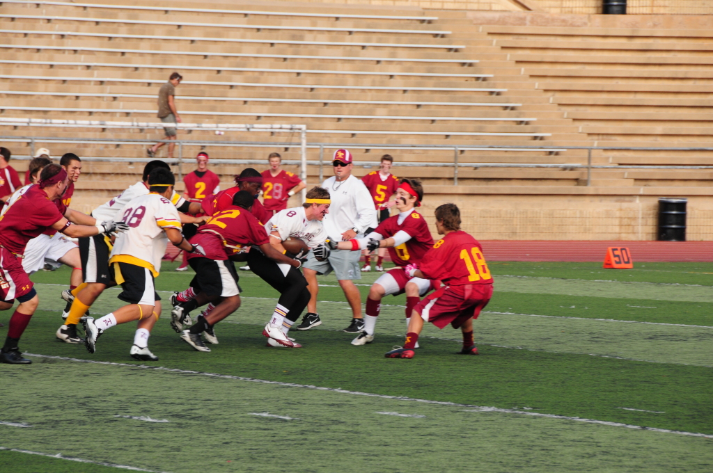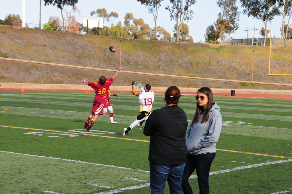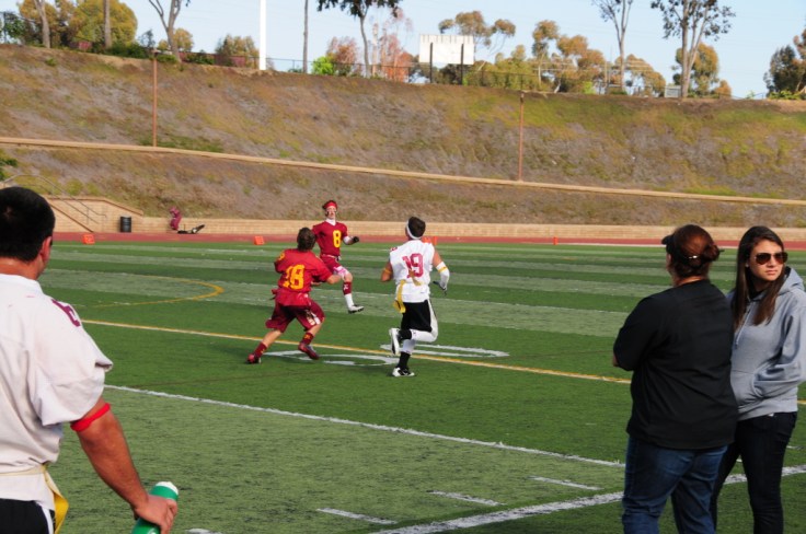 He still didn’t get a ton of playing time in at the annual Cardinal-Gold spring flag football bbq & game. But he did get in for one full series and batted away a pass. So here’s the pics from the photographers on the ground. He’s #18 this year and will be working a lot on his backpedaling skills!