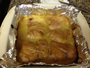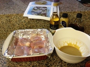 Prep – Place chicken thighs in foil lined baking dish – sprinkle on salt and pepper. Mix sauce in a bowl (3 ingredients in back)