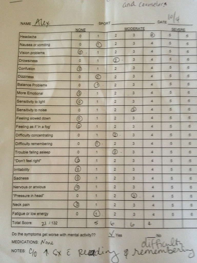 Oct 7 – Concussion scores 16’s concussion score sheet from Thursday. He needs a zero score for 3 days in a row before he can start activity again. This might take awhile Share this: Click to share on X (Opens in new window) X Click to share on Facebook (Opens in new window) Facebook Click to share on Reddit (Opens in new window) Reddit Click to email a link to a friend (Opens in new window) Email Click to print (Opens in new window) Print Click to share on LinkedIn (Opens in new window) LinkedIn Click to share on Pinterest (Opens in new window) Pinterest Click to share on Tumblr (Opens in new window) Tumblr Like Loading... Related Leave a comment Cancel reply Δ