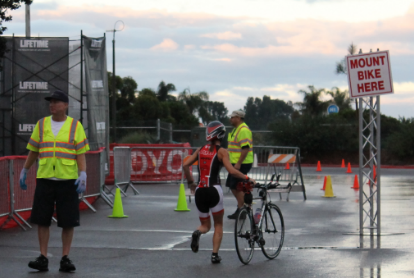 And yet – like I said, Eve as gotten fast what with all the training she has done all year with Renee preparing for R’s half Ironman next weekend so it was with some surprise, though not a ton, that I spotted her coming up the ramp about 4-5 minutes after our local competition. With a relay, all you have to do is get to the designated spot (where your bike rack is) and take the timing chip strap off one ankle and put it on the other. Because of that, 16 didn’t have the chance to get into a good position to see Renee bike out other than this shot as she left transition:
