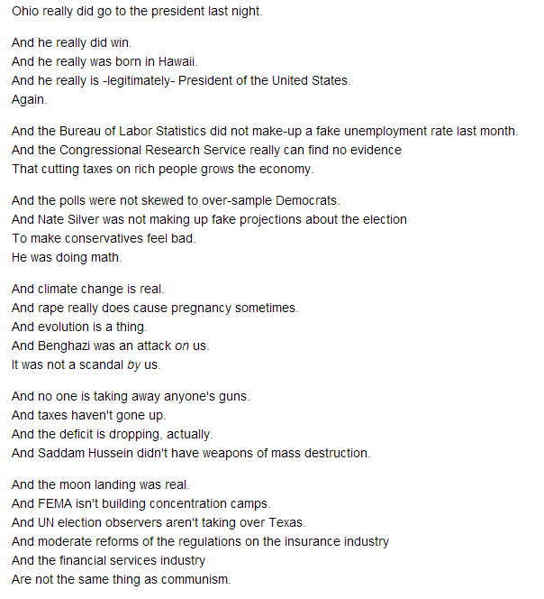 Evolution Is A Thing – courtesy of the opening segment of Rachel Maddow’s show last night. A beautiful list of FACTS and TRUTH and REALITY that even two days after the election, many in the GOP (specifically it’s pundits on TV) just do not seem to grasp. The script then goes on to explain why this is bad, and why it happens: