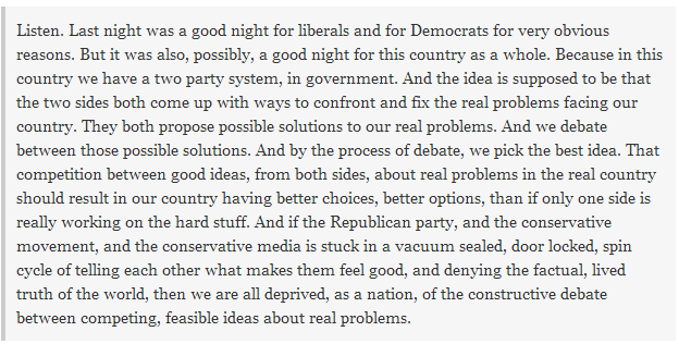 I really hope that Rachel is right and that this second Presidential defeat for the GOP results in a crack in their conservative media vacuum. I really do. Because the country IS stronger when both parties are strong.