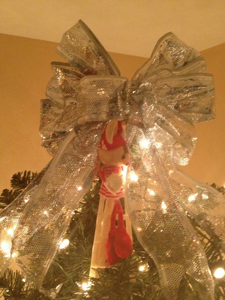So – let’s start at the top shall we? The bow topper is not the subject here though it is integral. But, the topper changes per my mood & lights burning out. No, the real star here is the mouse on the ladder “holding up” the tree topper.