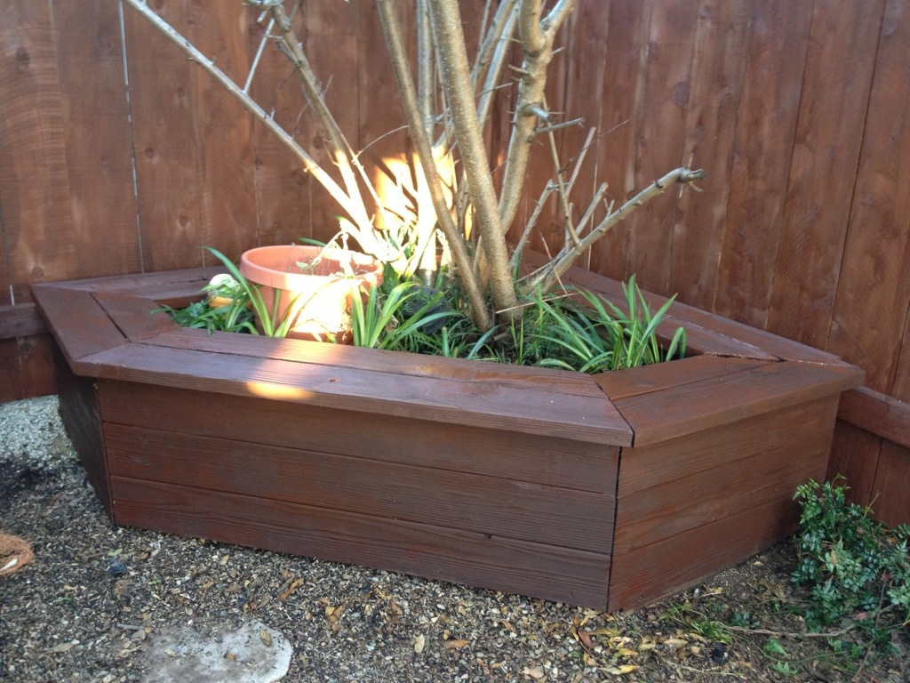 I figured I had just enough daylight – and then time after to clean myself up before NYE dinner – and I did have plenty of stain left, so I tackled the truly rotted and worn looking planter. Yeah, the wood is still in terrible shape, but damn, does it ever LOOK good now: