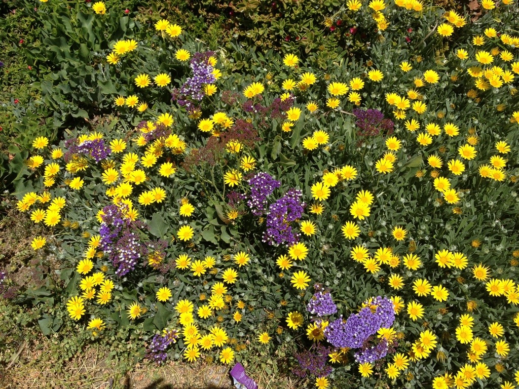 I went home for lunch earlier this week and was treated to this spectacular display for the first time this year. It’s either been cloudy, or, by the time I get home even if it is still light out, some of the flowers are starting to close. (nearly all of the daisies and groundcover close up at night). What I LOVE about my yard is that all of those flowers are self-propagating. I haven’t planted anything on that hillside in years. All we have to do is pull some weeds in spots where the yellow flower ground cover hasn’t totally taken over yet towards the back end of the hill. Which is what 16 and I were doing last weekend meaning I could take this pictures knowing it wouldn’t look TOO unkept!