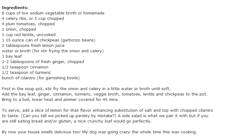 Yum yum and YUM! This soup is packed with proteins and ridiculously excellent nutrients thanks to the beans, spices and veggies. As you might see from her site – that is the focus.
