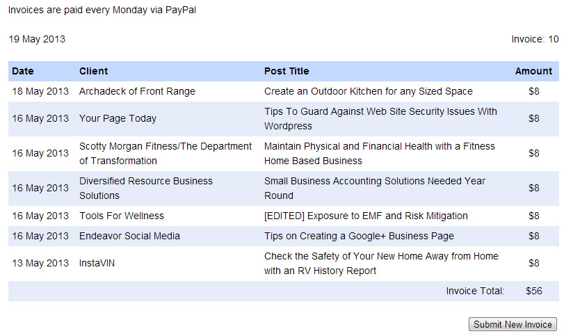 Saturday I woke up pain free and HAPPY! Oh yeah! I went to a boot camp and was thrilled to be able to do all the exercises with 100% effort. Then I had a meeting to learn about a new writing assignment for a local client, then I got home and wrote for Blogmutt to clear those off my agenda so I could write for the new client today. My goal was to write two posts, but I swear I was so amped up from feeling GOOD that I was able to knock out three and still have 30 minutes to spare! In a week when I would have been happy to sell 5 posts, instead I sold 7 ensuring another tank of gas will be funded by Blogmutt: