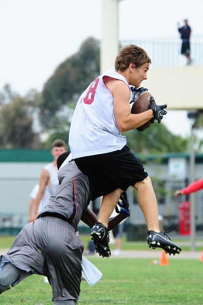 After the goofy Cardinal-Gold game, the boys had to put on their serious faces for a 2 day passing league tournament at the local college. It’s a different setting entirely because it is 7 on 7 touch football and truly is PASSING oriented. I think we ran a handful of draw plays, but that’s it. No other team ran one against us. The guys did pretty well – won 2 out of 3 on Saturday and then the first 2 on Sunday including a victory over the #2 seeded team that put them in the quarter finals. Unfortunately, they lost there. Fortunately, 16 saw a decent amount on playing time on offense and defense. Including a nice touchdown catch during the game against the #2 seed. What I loved most about the many hours spent in the hot sun this weekend? Seeing him being able to play full speed again competitively. After too long with that cranky knee, this is such a nice sight to behold: