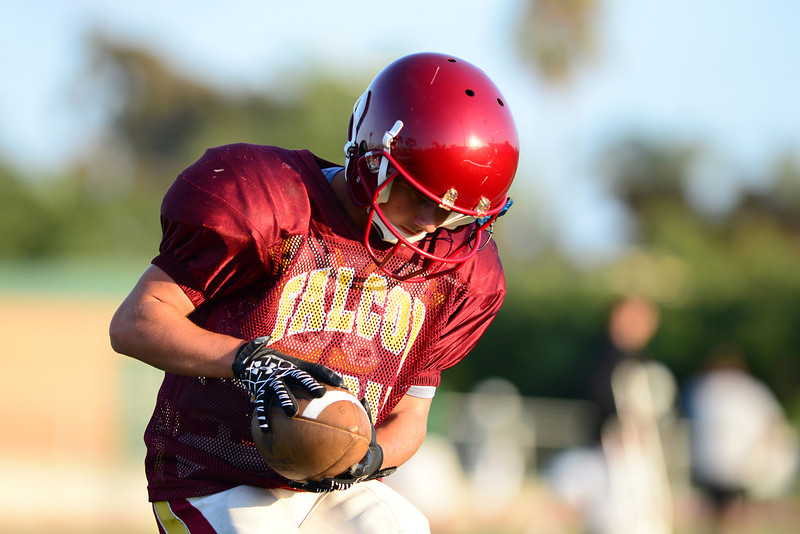 This year, as you can see above, he starts the season WITHOUT a knee brace for the first time in 5 seasons, and WITH a helmet on again! That is his personal SG Helmet ordered this summer and finally in our hands after a bit of color matching drama. Who knew “Cardinal” was so difficult to match?! Anyway, as you can see in the photo below, there is already a scratch on the front. Second or third say of contact practice, and he had a pretty big collision (according to him anyway). Coaches and other players were asking “are you OK? how’s your head?!” (reminder that he’s had two concussions in two years). He was fine – not even a tiny bit of pain or feeling of having had his bell rung.