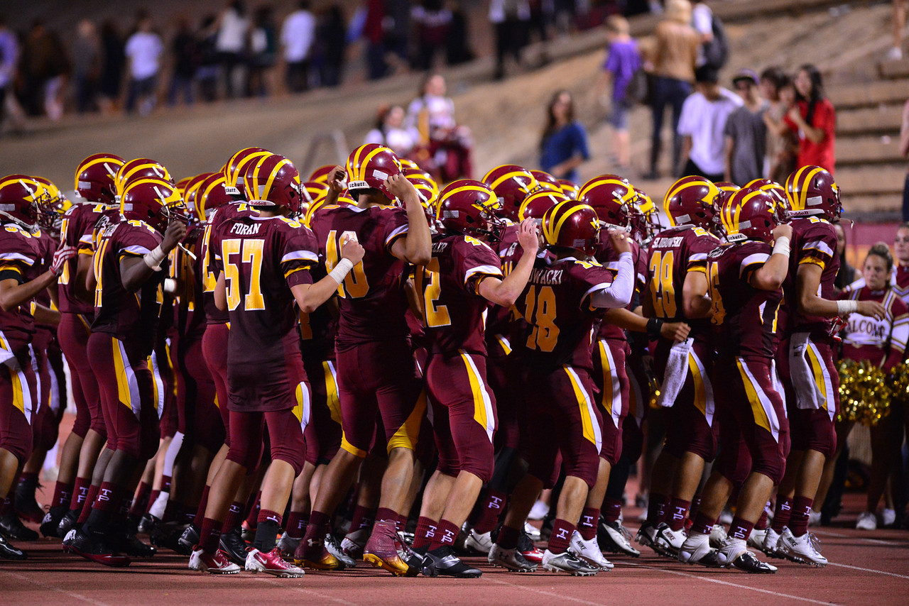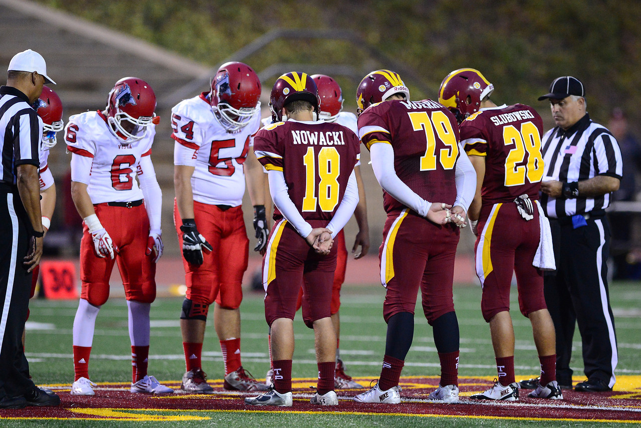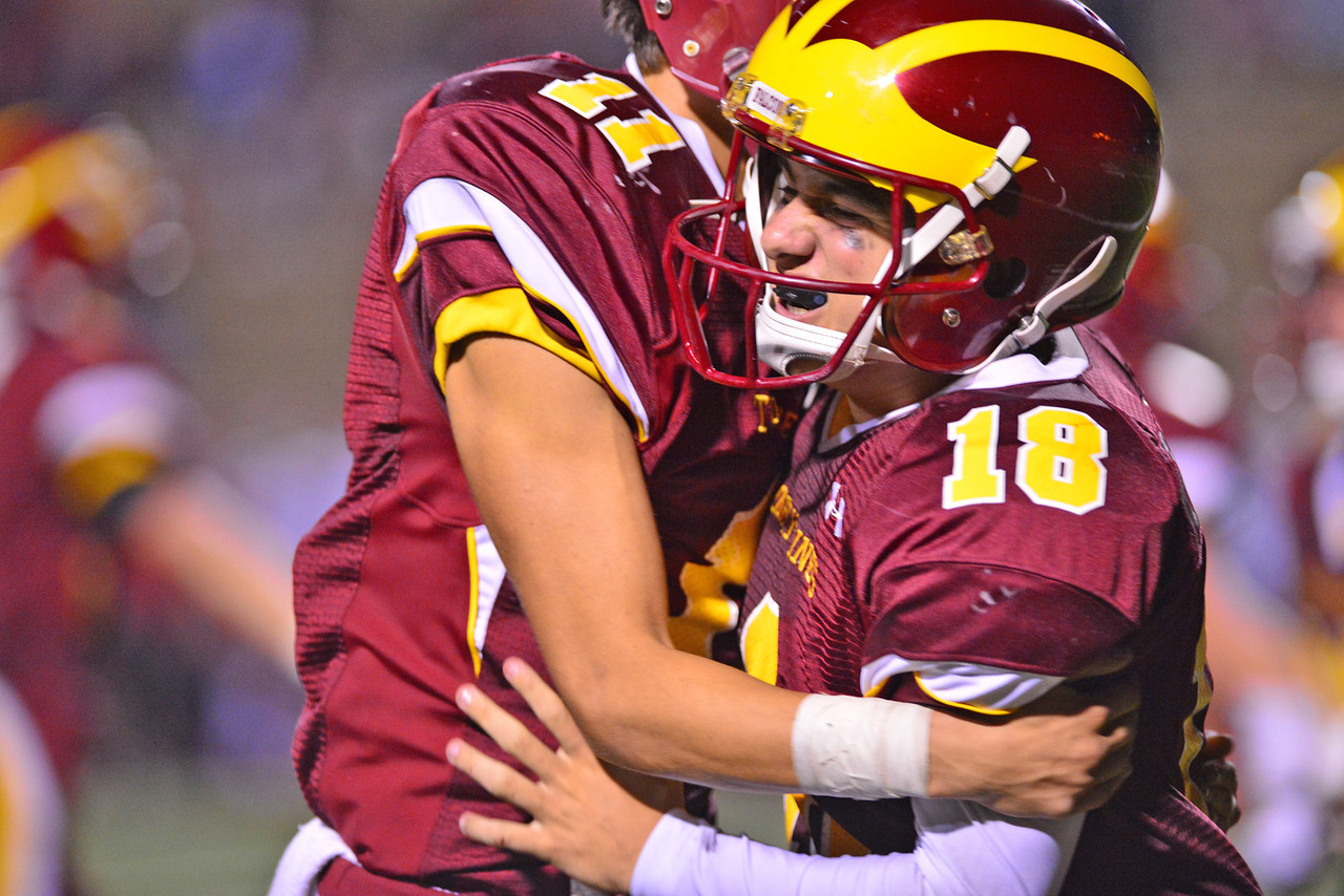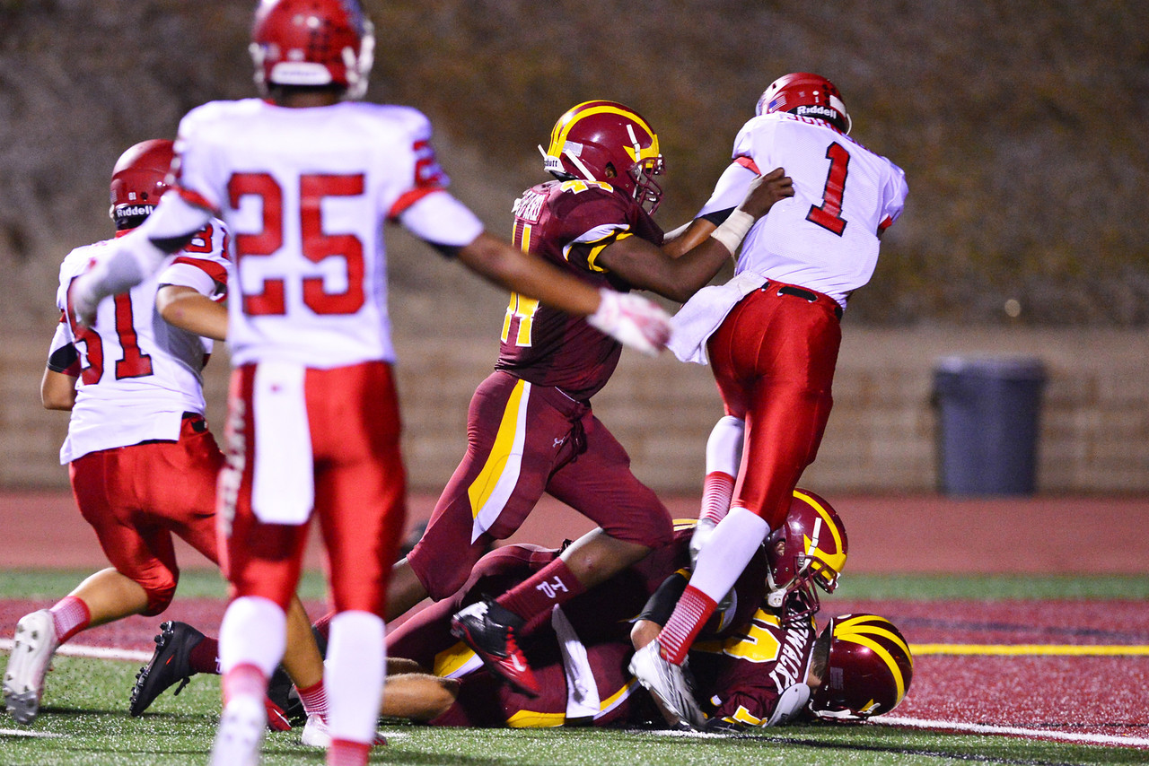 Unfortunately,there are no pictures of that play as it happened so fast and was on the far sideline away from the photographer. BUT – there was another play on a punt that resulted in a pretty cool sequence. The Falcons were punting, and it was 37-9 early in the 4th quarter. #18 was on punt coverage at that point and was running down the field to either down the punt or tackle the punt returner. As it turned out, the ball bounced free so the Falcons just needed to down it – as long as no Vista player touched it of course. Well, the ball took a rather unfortunate bounce (for Vista), right off the top of one of their players helmets…and right into the waiting hands of #18: