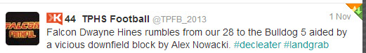 The highlight though, was a first half run featuring a couple of pretty spectacular blocks by #18. Just after the play, the parent who runs the team twitter account post this: