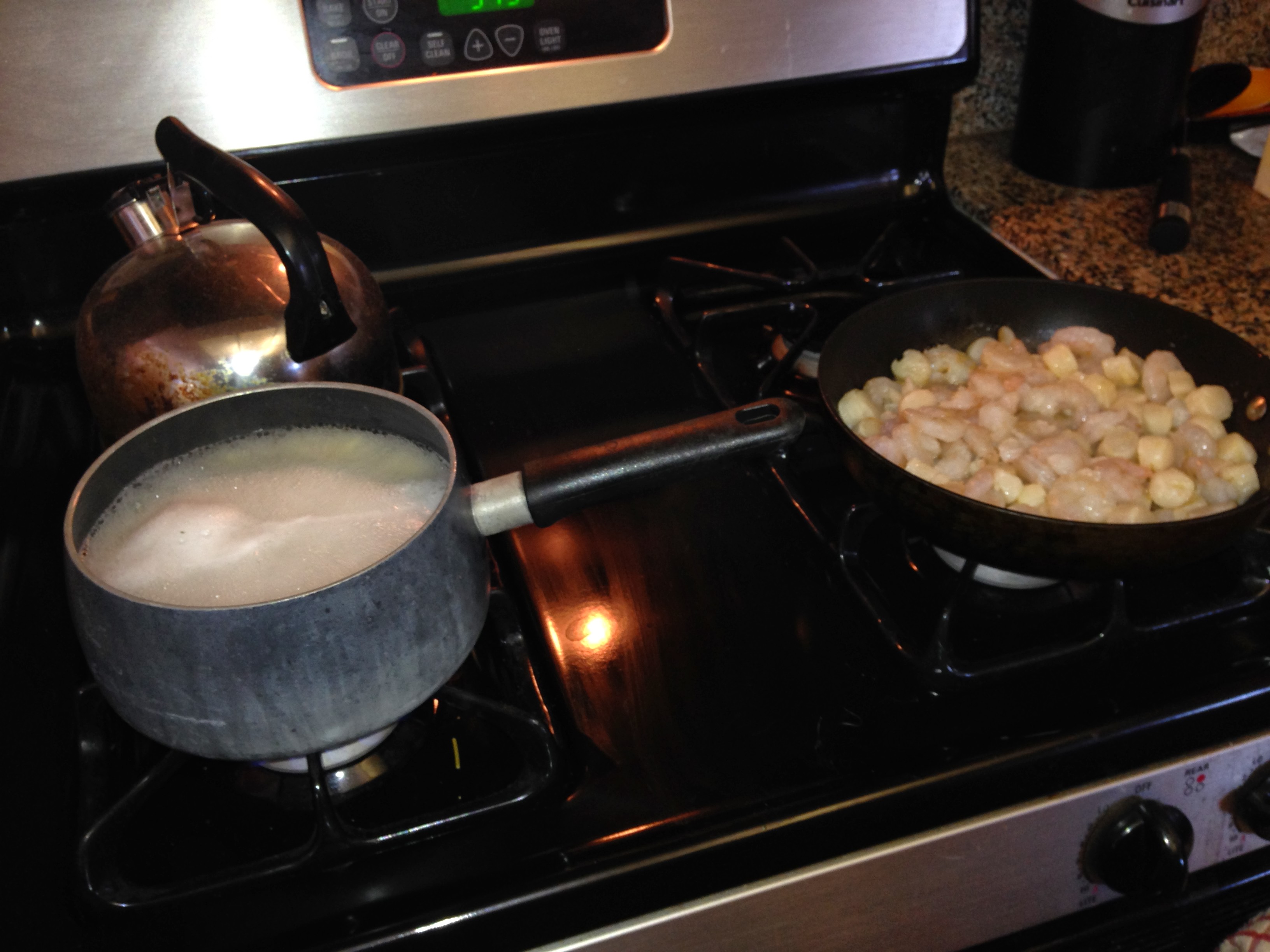 - Thoroughly rinse scallops and shrimp in cold water, drain, and cut scallops to desired size. I like a bite sized piece.
