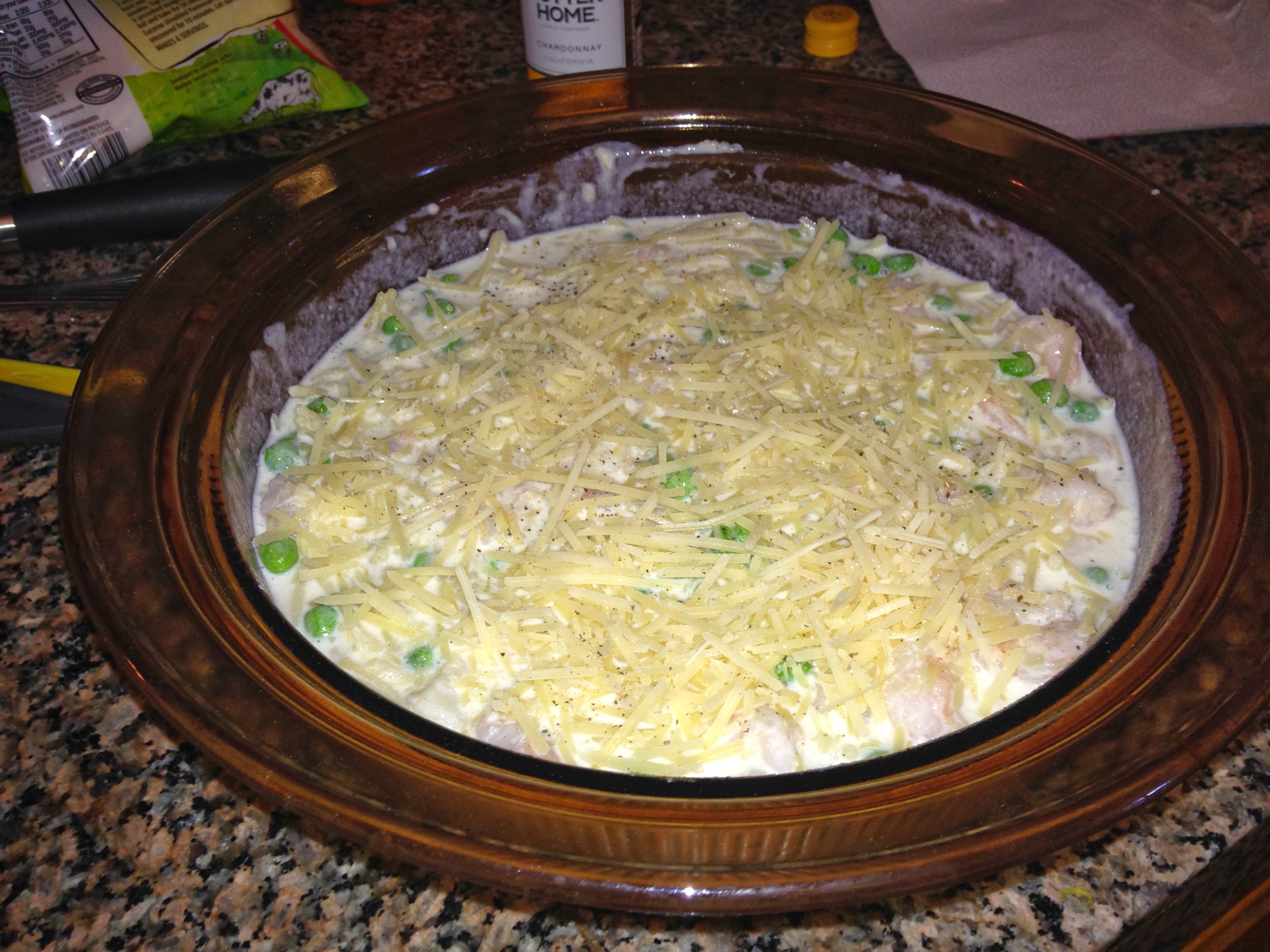 - The recipe calls for combining everything into the saucepan here – I only added the peas and wine to heat them. Then I mixed everything in the casserole dish. Original text: (Add scallops and mushrooms back to the pan. Add wine and peas. Continue stirring until heated through. Place spaghetti into saucepan with seafood mixture, and stir it all together until well mixed.)