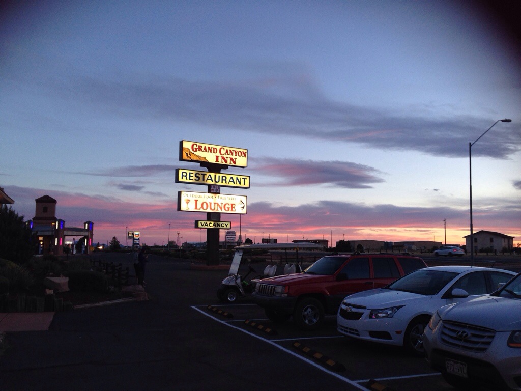 Wed, April 9th. Rolling into Arizona & the town outside the Grand Canyon. 500+ miles in 8 ish hours. One lunch stop & one gas/bathroom stop. Thank heavens for a rental car with satellite radio. Stand up comedy by Louis CK got us laughing so hard we couldn’t breathe and kept us sand the last 2 hours.