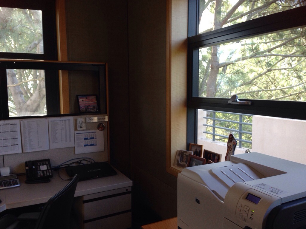 It’s cramped though – I lost all my floor space towards my back there. I’ve ordered a smaller printer stand that will be delivered soon and then I wont feel so jammed in. I do like the big window and that it has a nice ledge where I can put up all my personal photos & fun stuff. The morning sun comes in through that window above my monitors. It’s actually a glass door that leads out onto a balcony. Of course, all four (four?) of those doors in this office are now blocked off by cubicles so we have no direct access outside. This was an executive corner office for years. Then it was vacant for another span of years and now with the construction being done in the center of the building, all offices on the edges have been redesigned to hold cubicles. Miraculously only one person has shifted back down to the basement which is still completely empty from when we left in September.