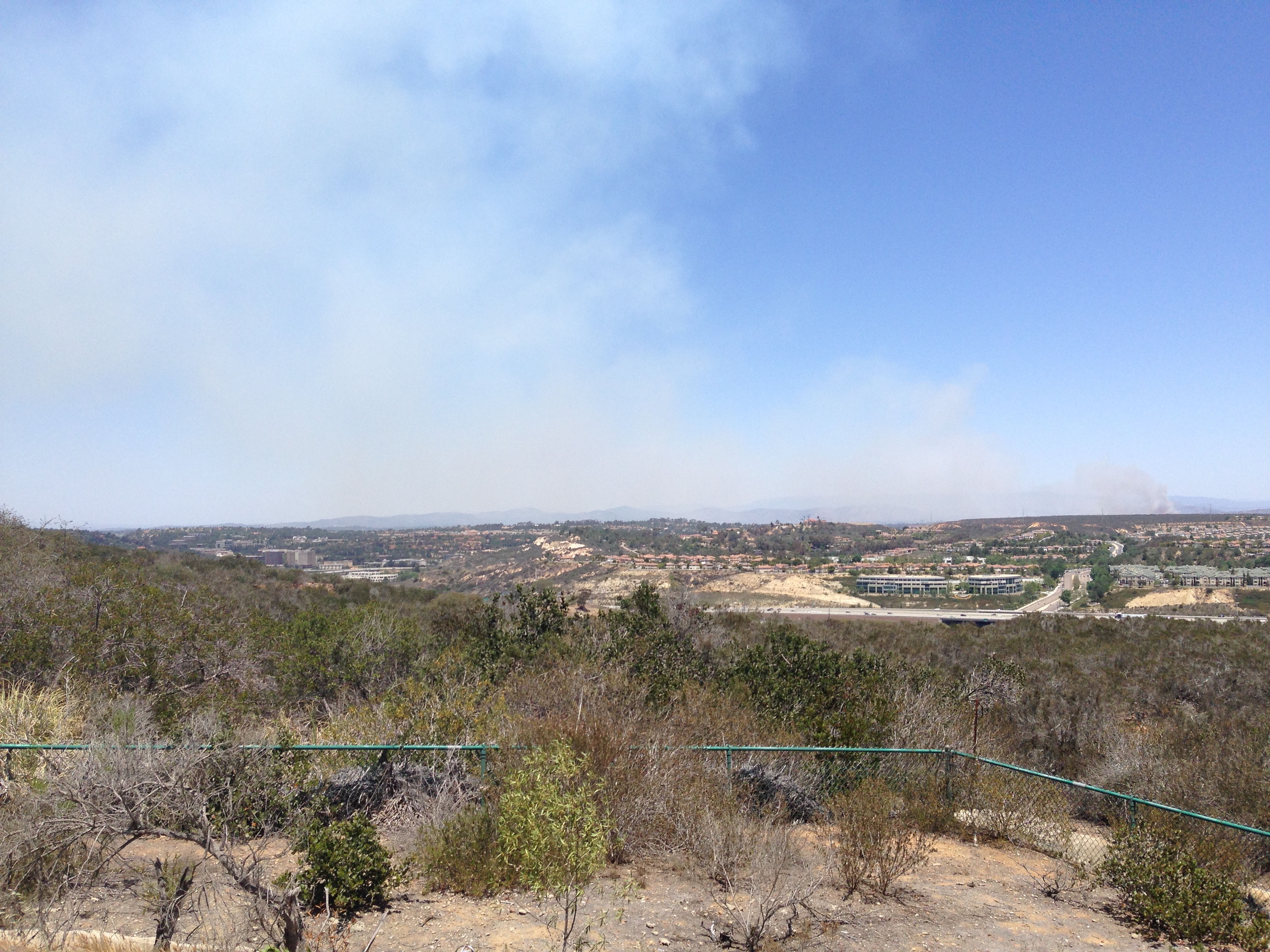 Sure enough – in the middle of a lot of new construction, but obviously with plenty of brush to fuel it, a fire is burning just east of where I work and live. These views are from the helipad on the eastern edge of the NU administrative headquarters on the Torrey Pines ridge.