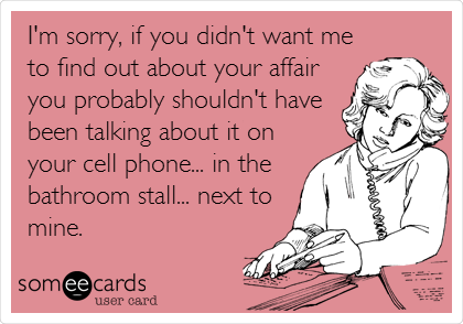Tiny bathroom. Me in the stall right next to her, hearing everything yet doing my best to tune it out. I was more appalled/self conscious about the fact the whoever she was talking to could probably hear ALL the background noise (if you know what I mean!)