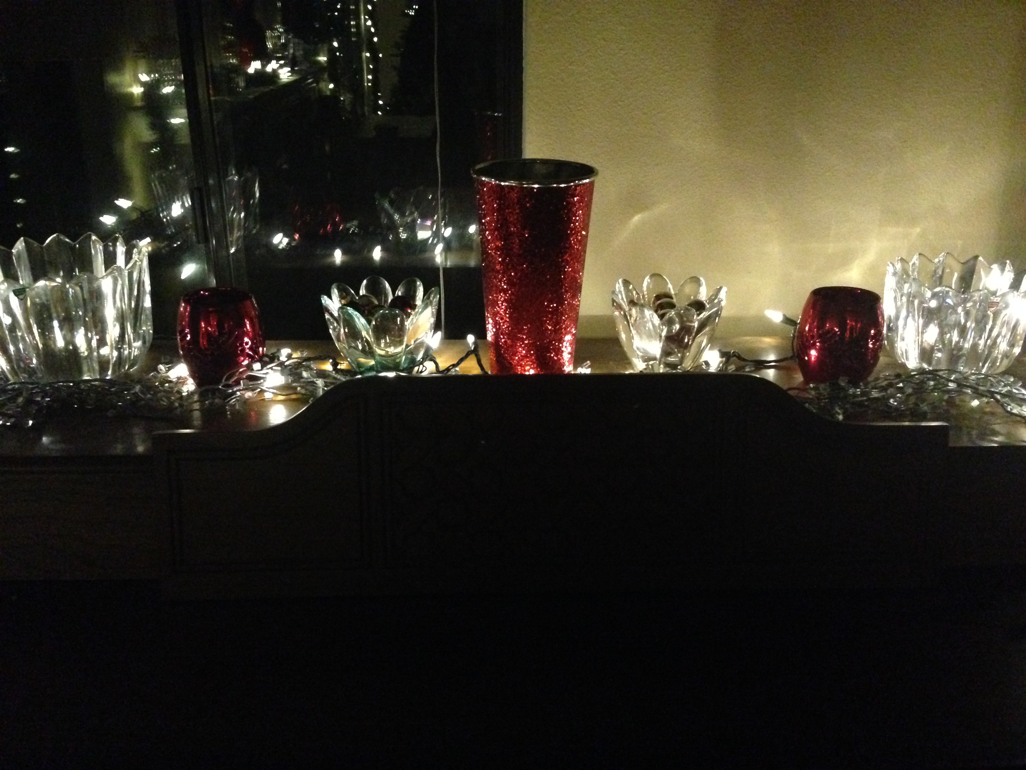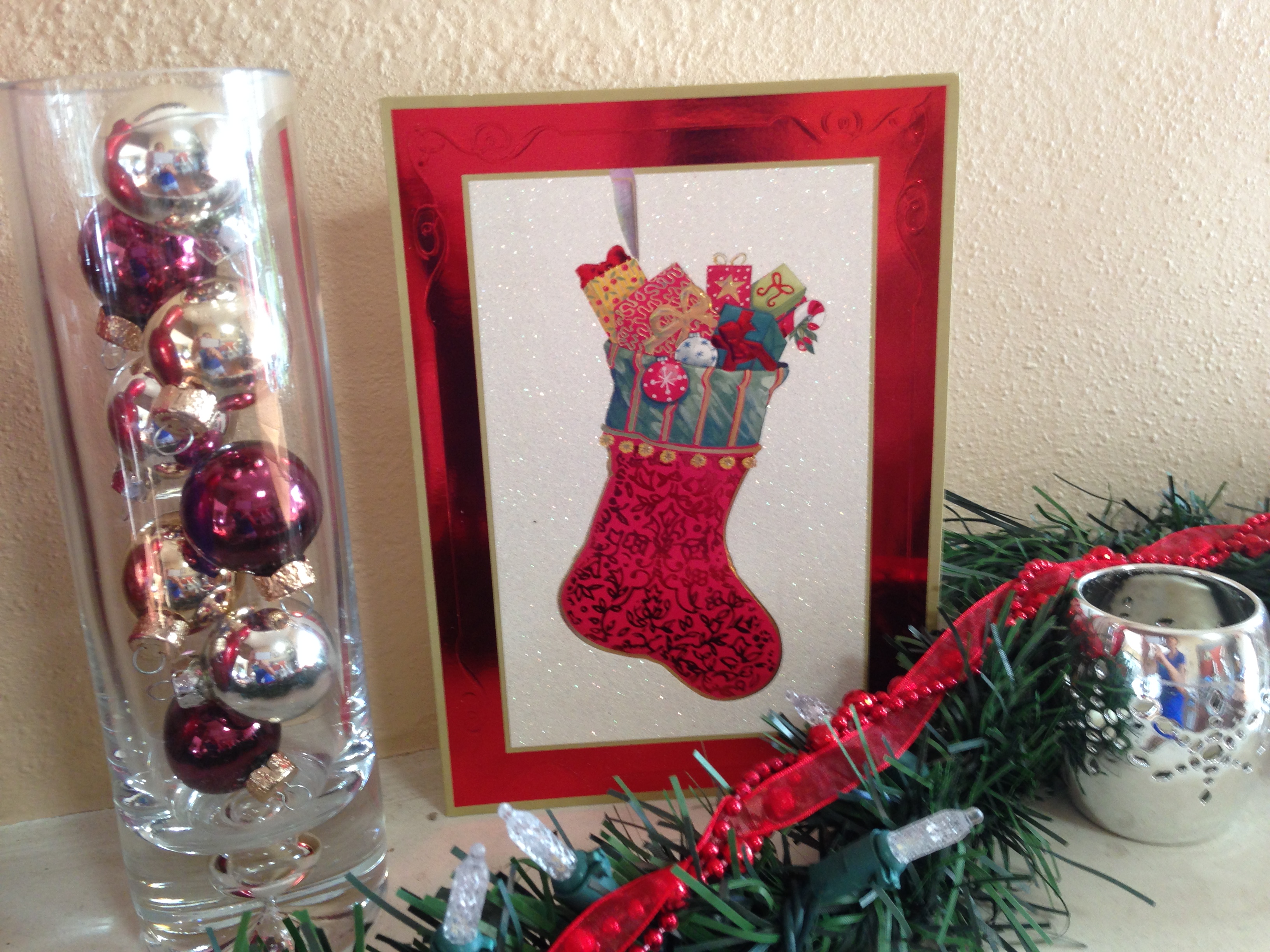 I had my own version of Christmas morning on the day I went into the garage to get out the boxes and start decorating outside: A whole shelf of new light displays that I totally forgot about buying at a year end sale last season!! The bells on either side of the garage and the bow displays on the side wall are from those. I also added some more twinkling LED sets to the front palm trees and another couple of sets of net lights. Otherwise it’s all pretty much the same though it seems like I cover more of the hillside each year 🙂 The photos are a mixture of inside and out. No time for captions – just enjoy the blend of old school and newfangled lights. Oh, and the first official card of the year on the mantle: